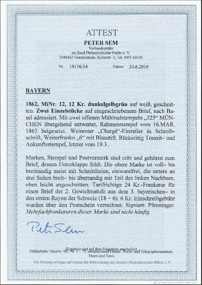 | Zusatzinformationen und Suchstichworte: | 372. Auktion Heinrich Köhler 14. Dezember 2019 Los 36 12 Kreuzer grün, 2 Einzelwerte, der eine oben etwas angeschnitten, sonst breit- bis überrandig, der andere gut voll- bis überrandig, mit oMR "325" und nebengesetztem Aufgabestempel "MÜNCHEN 16 MAR 1863" auf Chargé-Briefhülle der 2. Gewichtsstufe mit handschriftlichem Vermerk "gegen Schein" nach Basel in der Schweiz . Die untere Rückklappe der Briefhülle fehlt, sonst einwandfrei. Eine attraktive und portogerechte Mehrfachfrankatur ins Ausland. Signiert Pfenninger und Fotoattest Sem BPP (2019) Ausruf 200,00 EUR Zuschlag 600,00 EUR (aus der Sammlung Erivan Haub) |