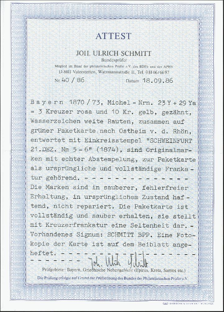 | Prüfer: | Schmitt, Joh. Ulrich (BPP (Bund Philatelistischer Prüfer)) |