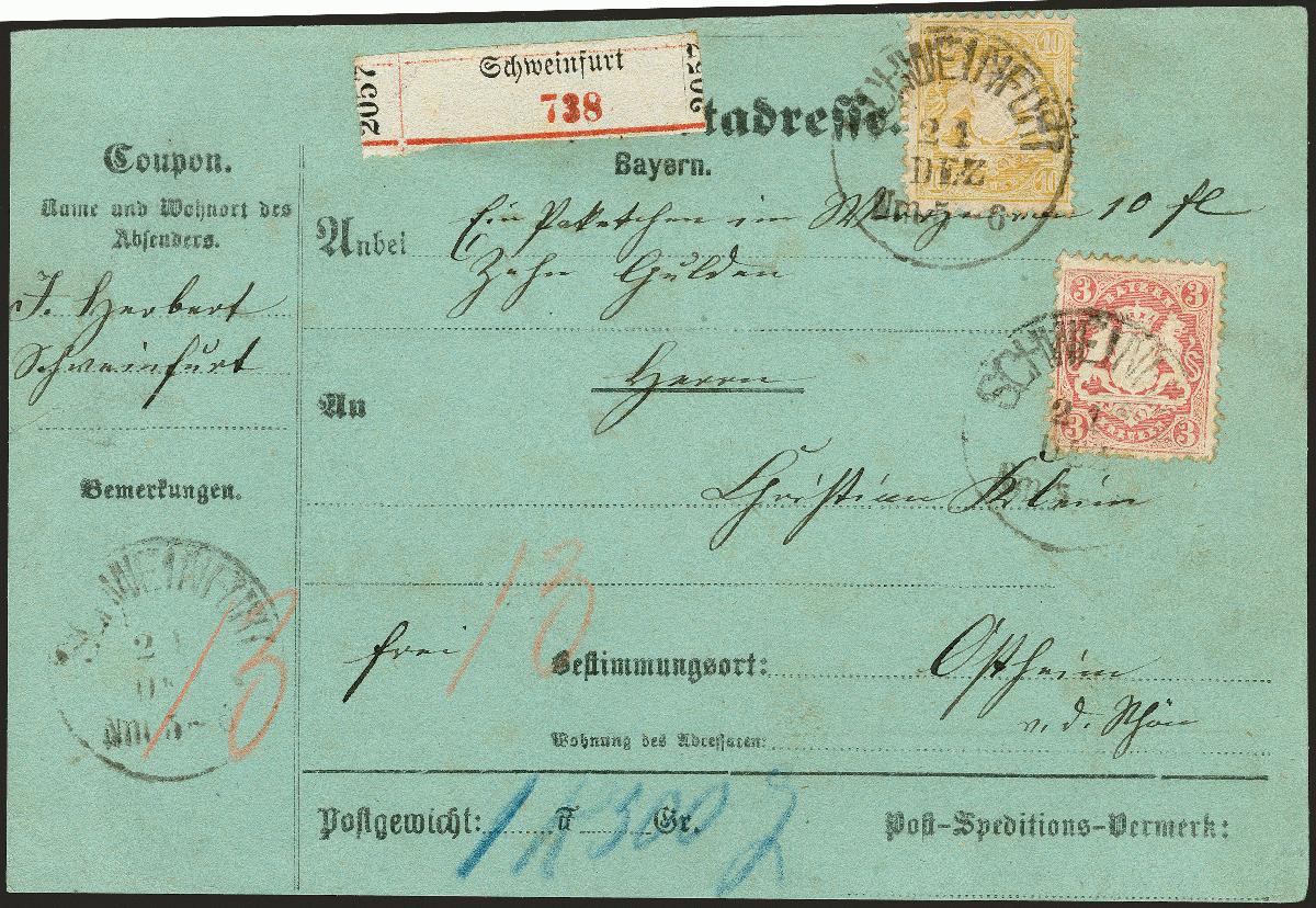 | Zusatzinformationen und Suchstichworte: | 372. Auktion Heinrich Köhler 14. Dezember 2019 Los 43 1870/73, Wappen gezähnt 3 Kreuzer rosa und 10 Kreuzer gelb, beide mit Wasserzeichen 'weite Rauten' mit EKr. "SCHWEINFURT 21 DEZ" (1874) auf vollständiger Paketkarte nach Ostheim. Sehr schöne und frische Erhaltung. Fotoattest Schmitt BPP (1986) Ausruf 200,00 EUR Zuschlag 700,00 EUR (aus der Sammlung Erivan Haub) |