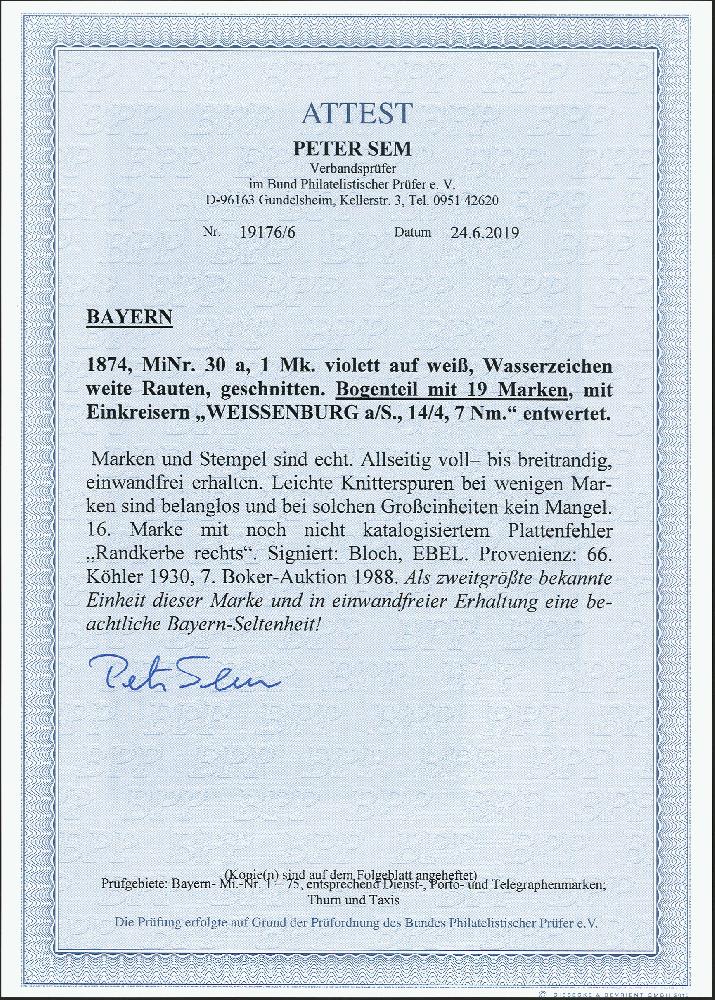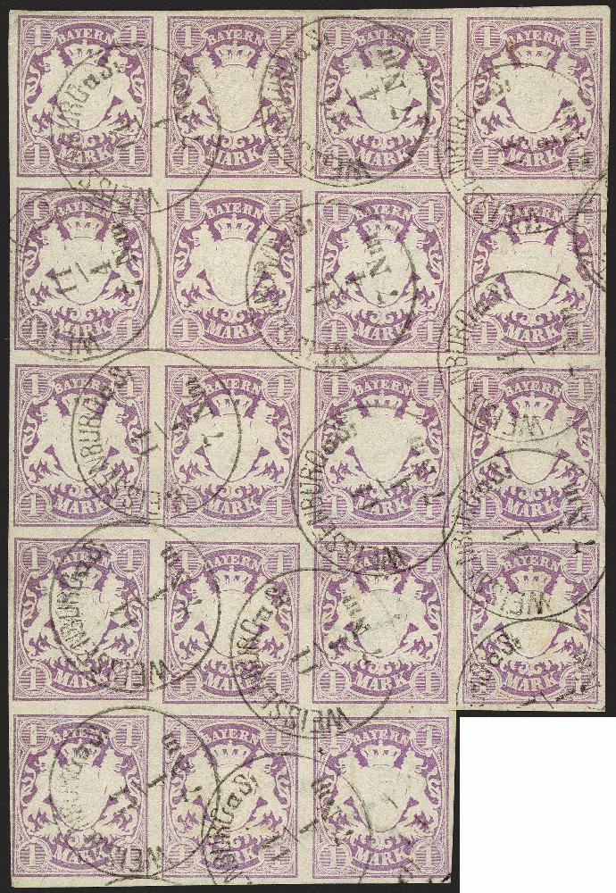 | Zusatzinformationen und Suchstichworte: | 372. Auktion Heinrich Köhler 14. Dezember 2019 Los 44 1874, 1 Mark violett, geschnitten, senkrechter Block von 19 Werten in frischer Farbe, allseits voll- bis meist breitrandig, sauber entwertet durch mehrfach aufgesetzten Einkreisstempel "WEISSENBURG a/S. 14/4". Der Block befindet sich bis auf minimale und belanglose Knitterspuren bei wenigen Marken in einwandfreier Erhaltung. Zweitgrößte bekannte gebrauchte Blockeinheit dieser Marke und als solche Unikat. Signiert Bloch und Ebel Ausruf 8.000,00 EUR Zuschlag 8.500,00 EUR (aus der Sammlung Erivan Haub) |