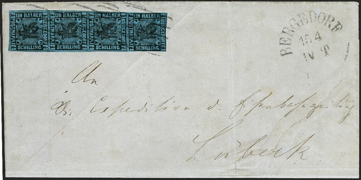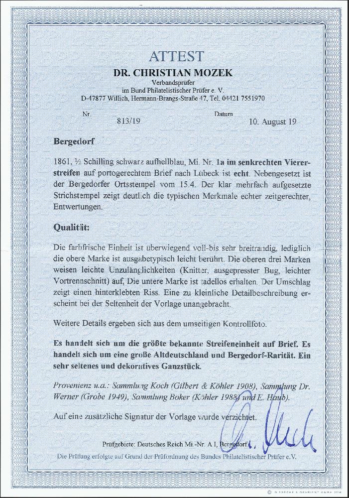 | Zusatzinformationen und Suchstichworte: | 372. Auktion Heinrich Köhler 14. Dezember 2019 Los 47 1861, Beiderstädtisches Wappen ½ Schilling schwarz auf hellblau im waagerechten 4er-Streifen, sehr schön farbfrisch und für diese Ausgabe hervorragend gerandet, die obere Marke am Oberrand gering berührt, sonst allseits voll- bis breitrandig, teils mit Zwischenlinien und unten mit kleinem Teil der Nachbarmarke, mit mehrfach aufgesetztem Strichstempel auf Briefhülle mit sauber nebengesetztem Aufgabestempel "BERGEDORF 15 4 IV T" nach Lübeck mit rückseitigem Ausgabestempel. 3 Werte des Streifens kleine Unzulänglichkeiten, die untere Marke tadellos. Schon gestempelte Paare sind von allen Bergedorf-Werten sehr selten, größere gebrauchte Einheiten gehören zu den großen Raritäten der Altdeutschland-Philatelie. Dies ist die größte gebrauchte Streifeneinheit dieser Marke und einer von nur 2 bekannten gebrauchten 4er-Streifen Bergedorfs. Fotoattest Dr. Mozek BPP (2019). Ausruf 30.000,00 EUR Zuschlag 75.000,00 EUR (aus der Sammlung Erivan Haub) |