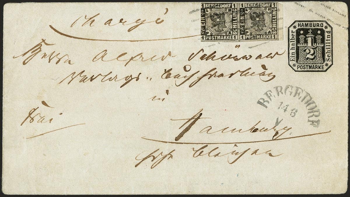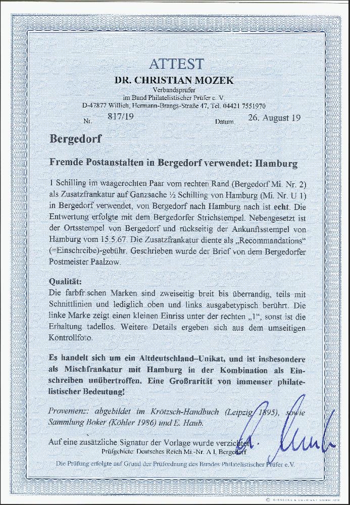 | Zusatzinformationen und Suchstichworte: | 372. Auktion Heinrich Köhler 14. Dezember 2019 Los 48 1861, 1 Schilling schwarz auf weiß im waagerechten Paar vom rechten Bogenrand, die linke Marke links und die rechte rechts oben ausgabetypisch etwas angeschnitten, sonst voll- bis breitrandig, rechts mit 2 mm Bogenrand, mit übergehend und sauber aufgesetztem Strichstempel als Zufrankatur auf Hamburger Ganzsachenumschlag ½ Schilling schwarz, als 'Chargé'-Brief des Bergedorfer Postmeisters Paalzow mit sauber nebengesetztem Aufgabestempel "BERGEDORF 14 6" (1867) nach Hamburg mit rückseitigem Ankunftsstempel vom nächsten Tag. Die linke Marke rechts unten kleiner Randriß, das Kuvert leicht senkrecht gefaltet, sonst einwandfrei. Dies ist der einzige von uns registrierte Chargé-Brief mit Bergedorfer Freimarken, in der portogerechten Mischfrankatur mit dem Hamburger Umschlag eine der ganz großen Seltenheiten der Altdeutschland-Philatelie. Fotoattest Dr. Mozek BPP (2019) Provenienz: Abgebildet im Krötzsch-Handbuch (1895), abgebildet im Grobe-Handbuch (1975), John Boker jr. (1986) Ausruf 40.000,00 EUR Zuschlag 40.000,00 EJR (aus der Sammlung Erivan Haub) |