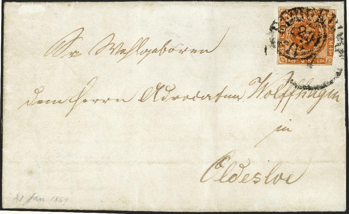 | Zusatzinformationen und Suchstichworte: | 372. Auktion Heinrich Köhler 14. Dezember 2019 Los 50 Dänemark 1858, 4 Skilling hellbraun mit gewelltem Grund, rechts unten etwas berührt, sonst voll- bis breitrandig mit sauber aufgesetztem Ortsstempel "BERGEDORF 21 1" (1859) und im Transit zusätzlich entwertet mit Nr. "2" des dänischen Postamtes von Hamburg auf komplettem Faltbrief, datiert "Sande den 21/1 1859" nach Oldesloe. Ein interessanter und seltener Brief; wir haben nur einen weiteren Brief mit einer derartigen Doppelentwertung registriert, dieser jedoch mit Dänemark Nr. 4. Fotoattest Dr. Mozek BPP (2019) Ausruf 800,00 EUR Zuschlag 800,00 EUR (aus der Sammlung Erivan Haub) |