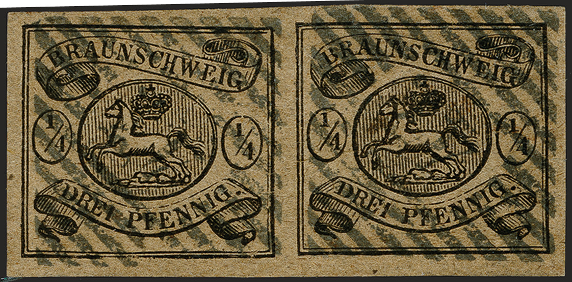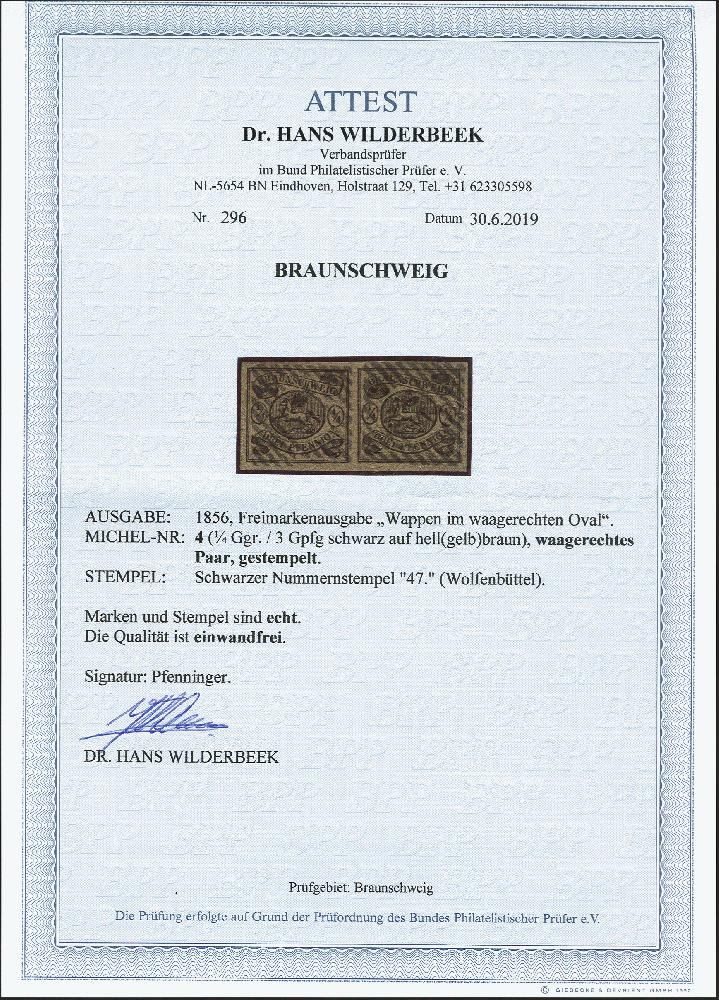 | Zusatzinformationen und Suchstichworte: | 372. Auktion Heinrich Köhler 14. Dezember 2019 Los 55 1853/56, Wappen ¼ Gutegroschen schwarz auf braun im waagerechten Paar, allseits sehr breitrandig und farbfrisch, jeder Wert mit zentrisch aufgesetzter Nr. "47" WOLFENBÜTTEL, Luxus, signiert Pfenninger und Fotoattest Dr. Wilderbeeck BPP (2019) Ausruf 200,00 EUR Zuschlag 240,00 EUR (aus der Sammlung Erivan Haub) |
