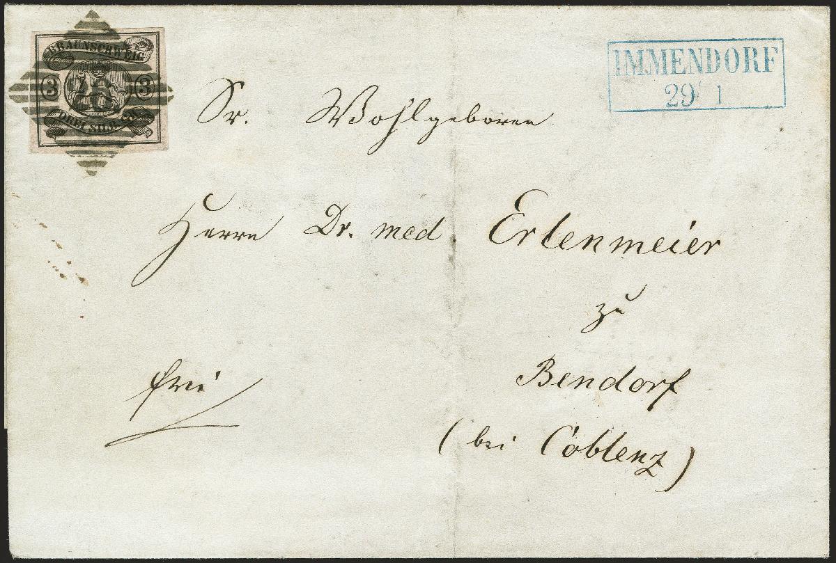 | Zusatzinformationen und Suchstichworte: | 372. Auktion Heinrich Köhler 14. Dezember 2019 Los 56 3 Silbergroschen auf mattgraurot, voll- bis breitrandig und farbfrisch mit glasklar aufgesetzter Nr. "26" und nebengesetztem blauen Rahmenstempel "IMMENDORF 29/1" auf Briefhülle nach Bendorf bei Koblenz mit rückseitigem Durchgangsstempel von Wartjenstedt und Bahnpoststempel "BERLIN/MINDEN". Die Hülle mit leichter Patina, sonst einwandfrei. Ein attraktiver Brief der 1860 geschlossenen Postexpedition. Fotoattest Dr. Wilderbeek BPP (2019) Ausruf 300,00 EUR Zuschlag 1.100,00 EUR (aus der Sammlung Erivan Haub) |