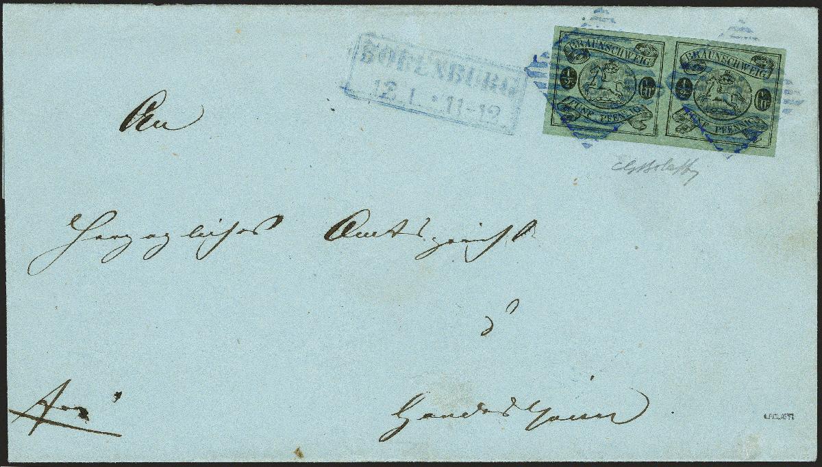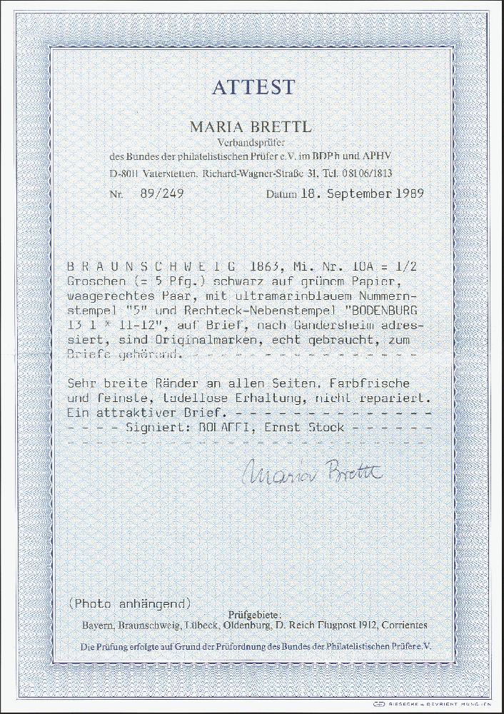 | Zusatzinformationen und Suchstichworte: | 372. Auktion Heinrich Köhler 14. Dezember 2019 Los 58 1861/63, Farbänderung ½ Groschen auf lebhaftgraugrün im waagerechten Paar, allseits breitrandig und farbfrisch mit zweimal aufgesetzter blauer Nr. "5" und nebengesetztem blauen Rahmenstempel "BODENBURG 13 1" auf Briefhülle nach Gandersheim. Eine der schönsten Paar-Frankaturen dieser Marke. Signiert Giulio Bolaffi und A. Bolaffi sowie Ernst Stock, Fotoattest Brettl BPP (1989) Ausruf 400,00 EUR Zuschlag 1.800,00 EUR (aus der Sammlung Erivan Haub) |