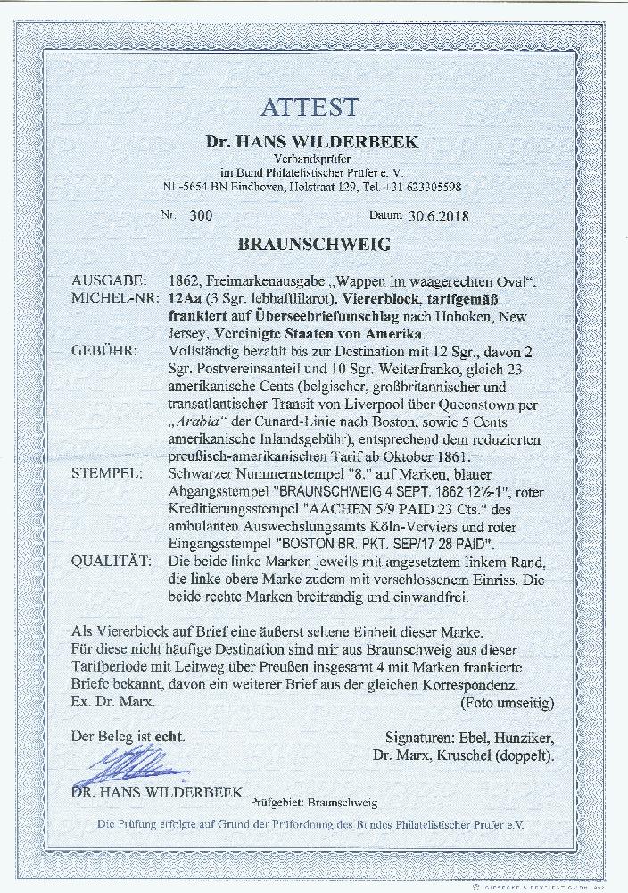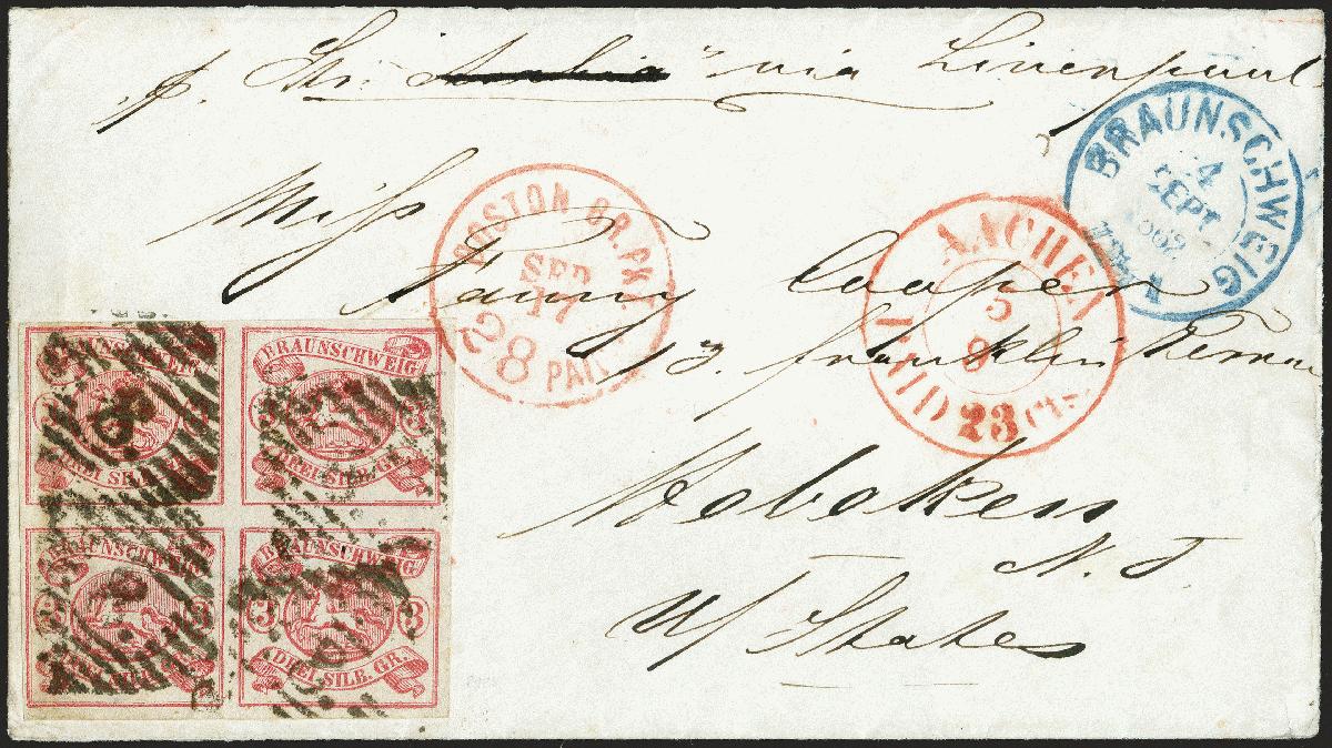 | Zusatzinformationen und Suchstichworte: | 372. Auktion Heinrich Köhler 14. Dezember 2019 Los 59 1862, Wappenausgabe 3 Silbergroschen rosa im 4er-Block, der linke Rand ergänzt, sonst voll- bis breitrandig und farbfrisch mit Nr. "8" und nebengesetztem blauen DKr. "BRAUNSCHWEIG 4 SEPT. 1862" auf Briefkuvert über die 'Prussian Closed Mail' über Aachen und Boston nach Hoboken im Staate New York. 4er-Blocks dieser Marke sind selten; auf Brief haben wir keinen weiteren registriert. Darüber hinaus ein außerordentlich seltener Auslandsbrief, von Braunschweig sind nur 4 Briefe mit dieser Destination und Leitweg registriert. Signiert Dr. Marx, Hunziker, Ebel und Kruschel sowie Fotoattest Dr. Wilderbeek BPP (2018) Ausruf 3.000,00 EUR Zuschlg 14.000,00 EUR (aus der Sammlung Erivan Haub) |
