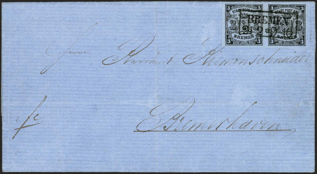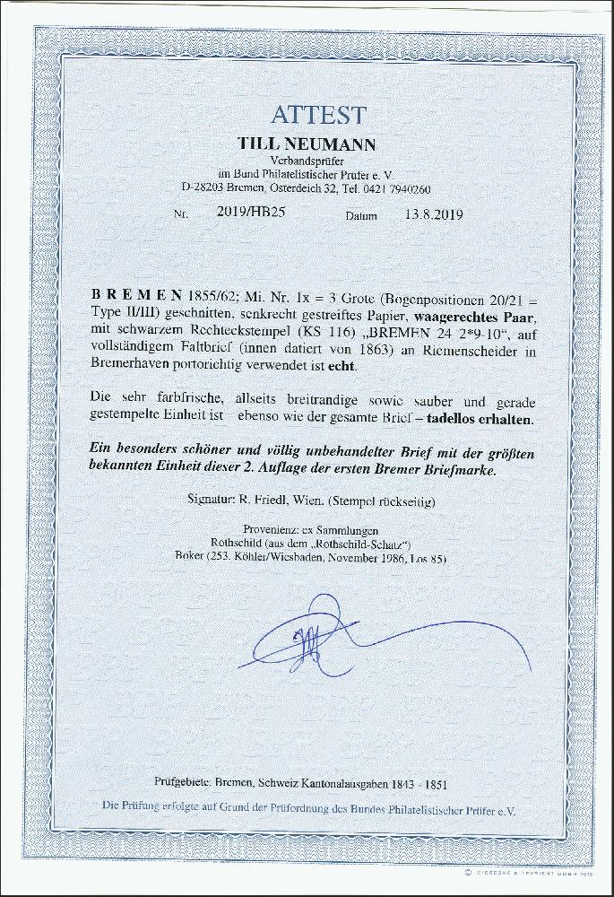 | Zusatzinformationen und Suchstichworte: | 372. Auktion Heinrich Köhler 14. Dezember 2019 Los 71 1855, 3 Grote schwarz auf blaugrau, senkrecht gestreiftes Papier, waagerechtes Paar der Typen II und III, sehr schön farbfrisch und allseits breitrandig, mit klar und sauber aufgesetztem Rahmenstempel "BREMEN 24 2" (1863) auf vollständigem Faltbrief nach Bremerhaven mit rückseitigem Ankunftsstempel vom selben Tag. Sehr schöne, frische und tadellose Erhaltung (in der Briefhülle minimale Falz-Schürfungen). Dieser Brief stellt eine der großen Seltenheiten der Bremen-Philatelie dar. Das Paar ist die größte gebrauchte Einheit dieser Marke und wir haben nur ein weiteres (ebenfalls auf Brief, jedoch mit anderen Typenkombination) registriert. Ein phantastisches und altbekanntes Stück. Signiert Friedl, Wien und Ladislaus Varga sowie Fotoattest Neumann BPP (2019) Ausruf 18.000,00 EUR Zuschlag 32.000,00 EUR (aus der Sammlung Erivan Haub) |