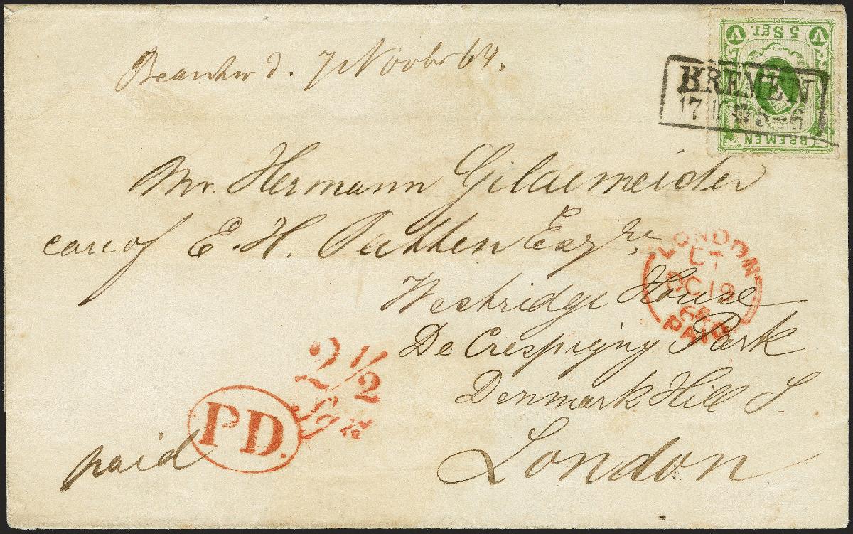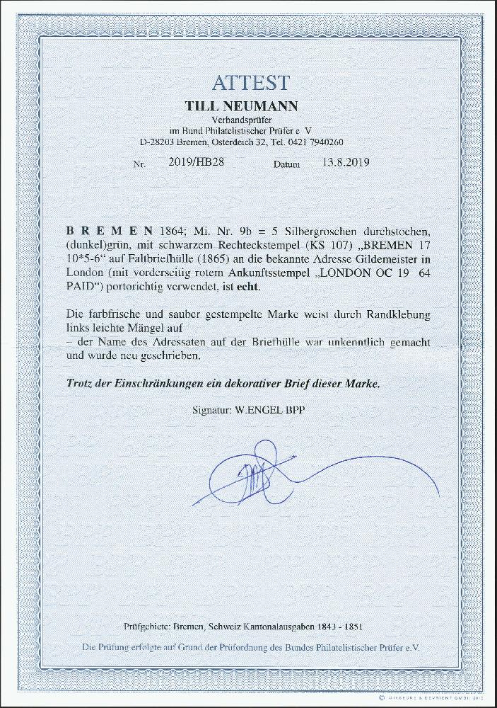 | Zusatzinformationen und Suchstichworte: | 372. Auktion Heinrich Köhler 14. Dezember 2019 Los 73 1863/64, 5 Silbergroschen grün durchstochen 16, farbfrisch und gut durchstochen (durch Randklebung links leicht fehlerhaft), mit sauberem Rahmenstempel "BREMEN 17 10" (1865) auf Briefhülle der bekannten Gildemeister-Korrespondenz nach London; der Name in der Adresse war unkenntlich gemacht und ist neu geschrieben, sonst schöne Erhaltung. Signiert W. Engel BPP und Fotoattest Neumann BPP (2019) Ausruf 500,00 EUR Zuschlag 600,00 EUR (aus der Sammlung Erivan Haub) |