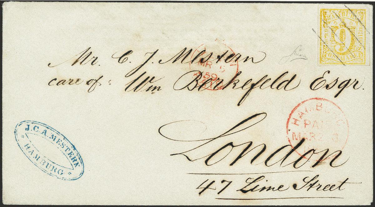 | Zusatzinformationen und Suchstichworte: | 372. Auktion Heinrich Köhler 14. Dezember 2019 Los 76 1859, Wertangabe im Hamburger Wappen, 9 Schillinge gelb in der typischen Nuance der missglückten ersten Auflage, voll- bis breitrandig, mit leicht aufgesetztem Strichstempel und nebengesetztem roten "HAMBURG PAID MÄRZ 3 1859" auf Briefkuvert der bekannten Berkefeld-Korrespondenz nach London. Das Kuvert um die Marke herum etwas gereinigt, sonst einwandfrei. Eine attraktive und seltene Einzelfrankatur. Fotoattest Mehlmann BPP (2019) Ausruf 6.000,00 EUR unverkauft (aus der Sammlung Erivan Haub) |