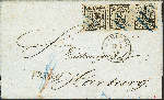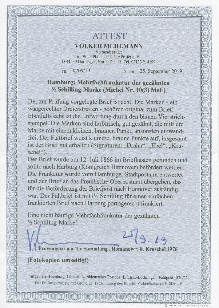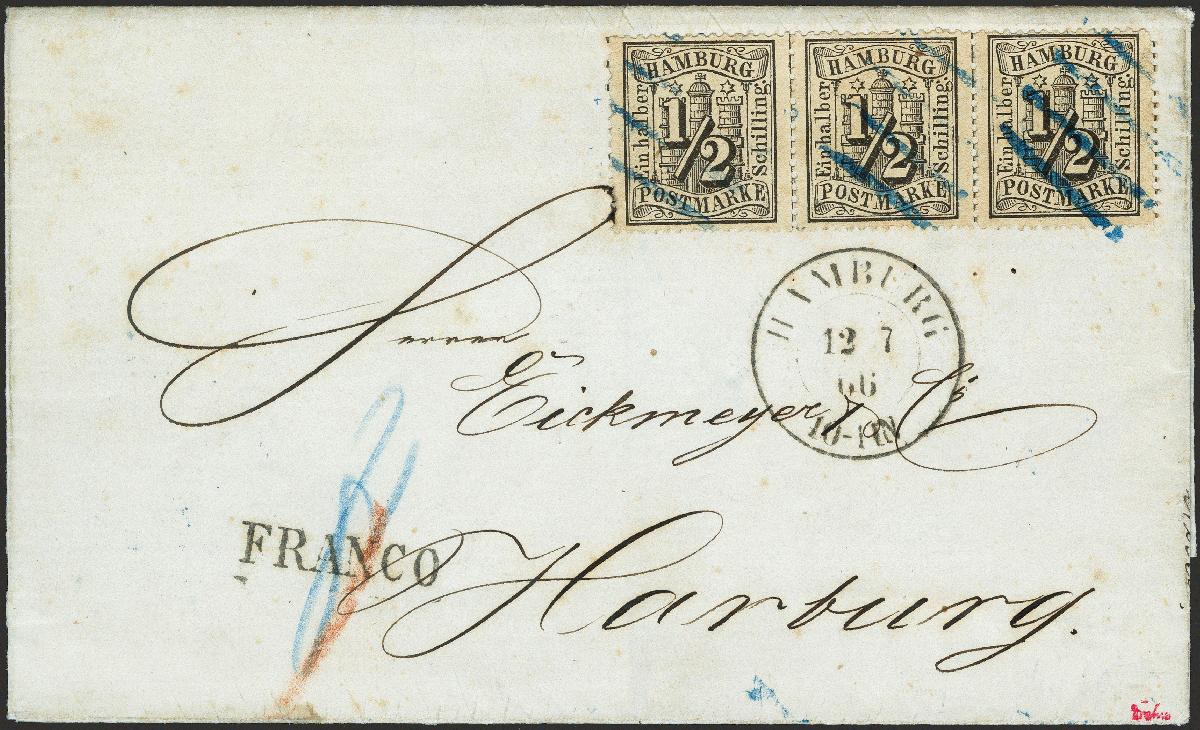 | Zusatzinformationen und Suchstichworte: | 372. Auktion Heinrich Köhler 14. Dezember 2019 Los 79 1864/67, gezähnte Ausgabe, ½ Schilling schwarz auf weiß, waagerechter Dreierstreifen, farbfrisch und gut gezähnt, die mittlere Marke mit kleinem Leimfleck, sonst einwandfrei, mit blauem Strichstempel des Stadtpostamtes auf Briefhülle mit Übernahme-Doppelkreisstempel des preußischen Oberpostamtes "HAMBURG 12/7 67" nach Harburg in Hannover mit Ankunftsstempel vom gleichen Tag. Fotoattest Mehlmann BPP (2019) Ausruf 200,00 EUR Zuschlag 340,00 EUR (aus der Sammlung Erivan Haub) |