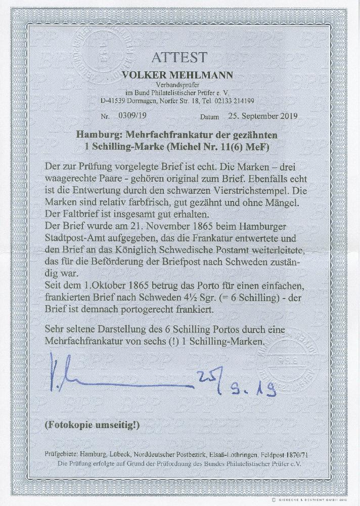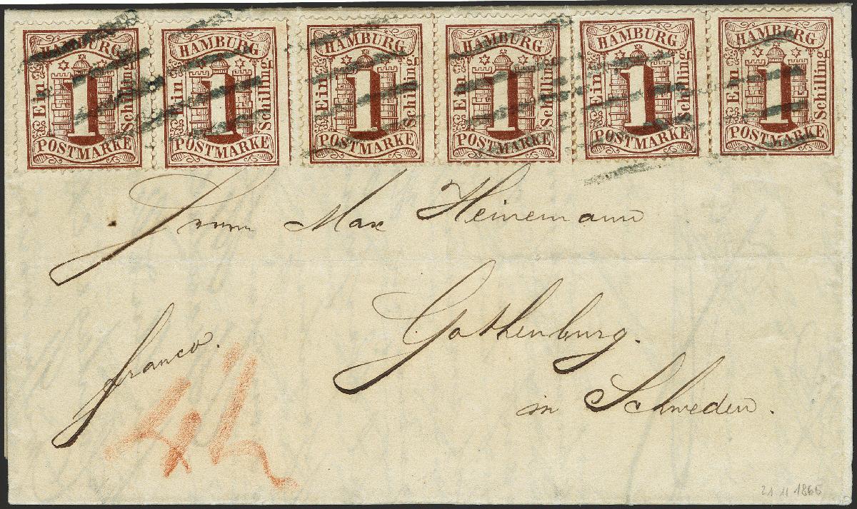 | Zusatzinformationen und Suchstichworte: | 372. Auktion Heinrich Köhler 14. Dezember 2019 Los 80 1 Schilling braun, 3 waagerechte Paare, farbfrisch und gut gezähnt, mit schwarzem Strichstempel des Stadtpostamtes auf komplettem Faltbrief mit rückseitigem Übernahmestempel des schwedischen Postamtes "HAMBURG K.S.P.A. 21/11 1865" 12/7 67" nach Gothenburg in Schweden. Ein attraktiver Brief mit sowohl seltener Mehrfachfrankatur als auch -Destination. Fotoattest Mehlmann BPP (2019) Ausruf 2.000,00 EUR Zuschlag 2.000,00 EUR (aus der Sammlung Erivan Haub) |