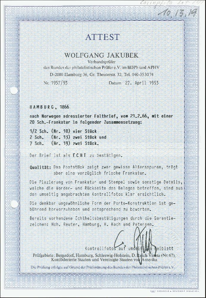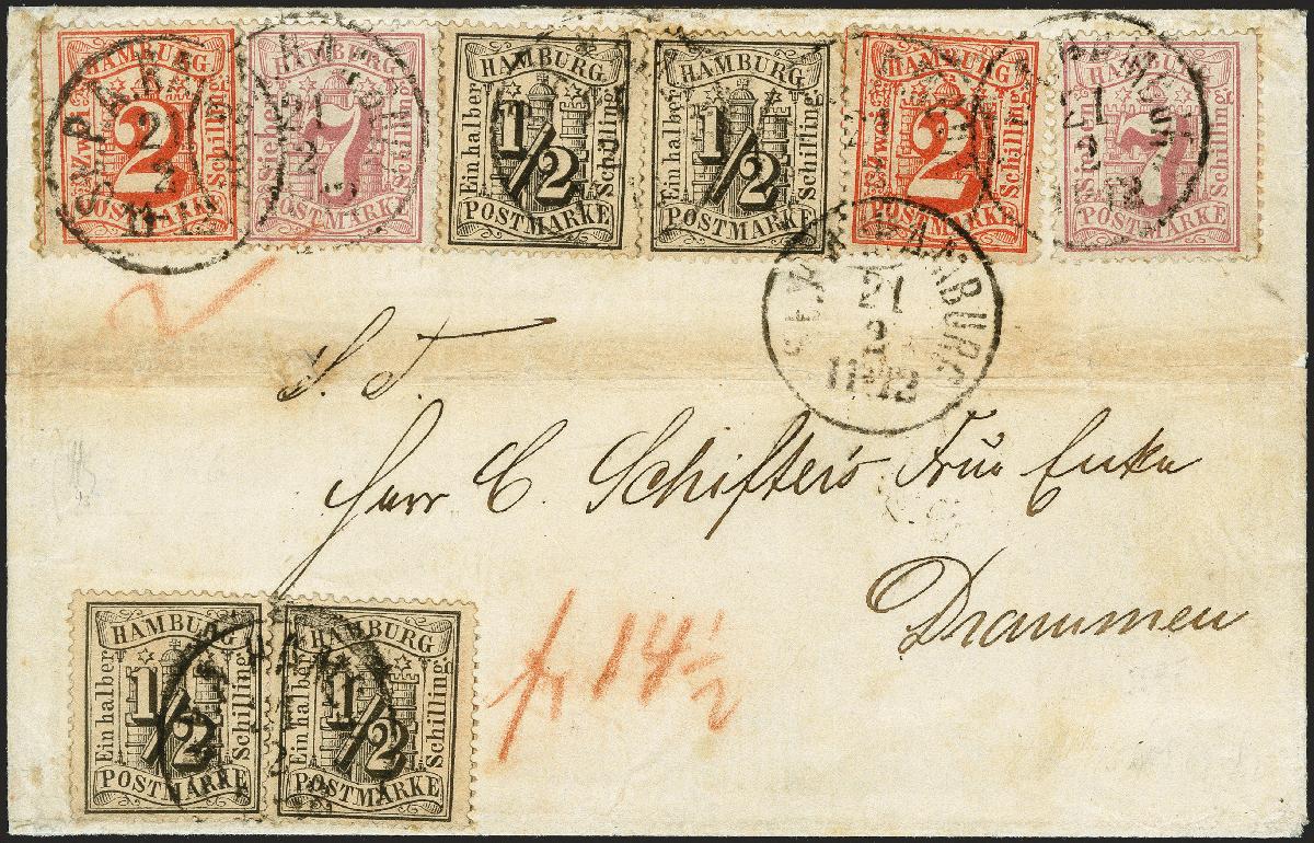 | Zusatzinformationen und Suchstichworte: | 372. Auktion Heinrich Köhler 14. Dezember 2019 Los 81 1864/67, ½ Schilling schwarz, 4 Einzelwerte zusammen mit je 2 Einzelwerten 2 Schilling orangerot und 7 Schilling graulila, alle farbfrisch und überwiegend gut gezähnt, mit EKr. "St.P.A. HAMBURG 21 2" (1866) auf Briefhülle der 2. Gewichtsstufe nach Drammen in Norwegen mit ausgewiesenem Weiterfranko von 14½ Schillingen; rückseitig Anlandestempel von Christiania. Der Brief zeigt eine waagerechte Faltung außerhalb der Frankatur und an einigen Stellen kleine Papierfehler, teils durch Falze hinterklebt. Die Frankatur befindet sich in ursprünglichem und frischem Zustand; die links klebende 2 Schilling mit kleinen Beanstandungen in der Zähnung, sonst einwandfrei. Eine außerordentlich seltene und sehr dekorative 20 Schilling-Frankatur; wir haben keine weitere registriert. Fotoattest Jakubek BPP (1993) Ausruf 6.000,00 EUR Zuschlag 14.000,00 EUR (aus der Sammlung Erivan Haub) |
