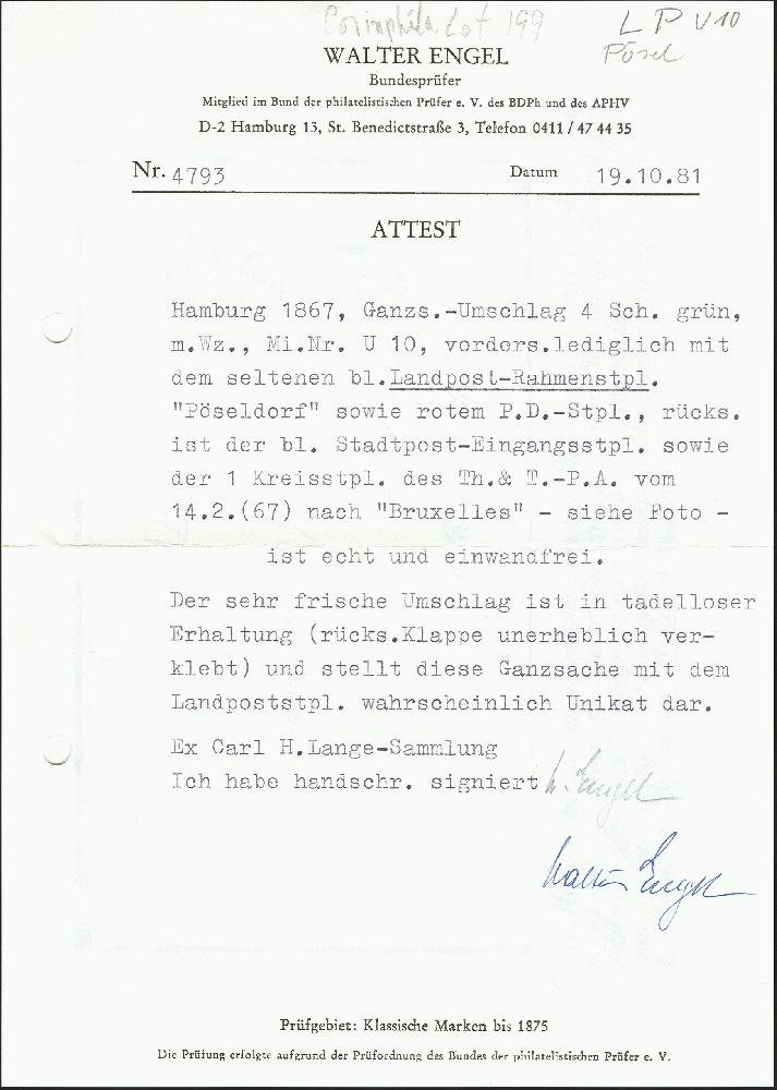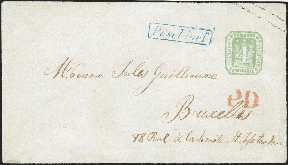 | Zusatzinformationen und Suchstichworte: | 372. Auktion Heinrich Köhler 14. Dezember 2019 Los 87 Umschlag 4 Schilling grün mit nebengesetztem blauen Landpoststempel "Pöseldorf" nach Brüssel, rückseitig mit diversen Transit- und Ankunftsstempeln einschließlich Ovalstempel des Stadtpostamtes und EKr. des Thurn und Taxisschen Postamtes sowie Ankunftsstempel vom 15. Februar 1967. Das Kuvert wurde sehr rauh geöffnet, am Oberrand links und in den Faltungen restauriert und etwas gereinigt. Wir haben etwa ein Dutzend Briefe der Landpostorte ins Nichtvereins-Ausland registriert, davon stammen vier aus derselben Korrespondenz wie der hier angebotene. Ein attraktiver und seltener Brief. Attest Walter Engel BPP (1981) Ausruf 500,00 EUR Zuschlag 500,00 EUR (aus der Sammlung Erivan Haub) |