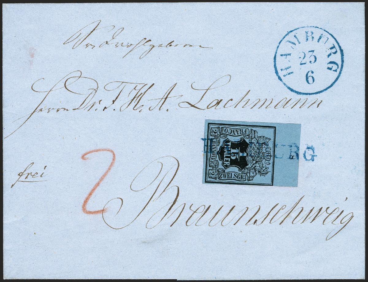 | Zusatzinformationen und Suchstichworte: | 372. Auktion Heinrich Köhler 14. Dezember 2019 Los 93 1851, Postvereinsausgabe 1/15 Taler schwarz auf graublau, rechts oben etwas berührt, sonst voll- bis breitrandiges Oberrandstück mit ca. 8 mm Bogenrand und Reihenzähler "8" mit blauem Langstempel "HAMBURG" und nebengesetztem blauen EKr. "HAMBURG 23 6" auf Briefhülle nach Braunschweig, sehr schönes Stück. Fotoattest Berger BPP (2019) Ausruf 300,00 EUR Zuschlag 420,00 EUR (aus der Sammlung Erivan Haub) |
