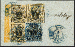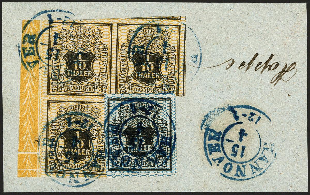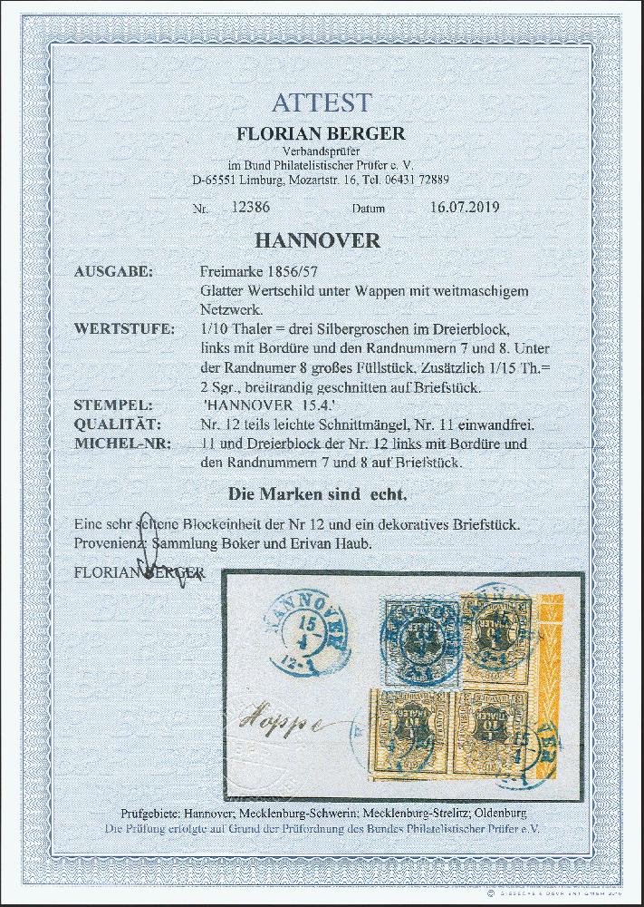 | Zusatzinformationen und Suchstichworte: | 372. Auktion Heinrich Köhler 14. Dezember 2019 Los 98 1856/57, Wappenausgabe mit Netzunterdruck 1/10 Taler schwarz, orangegelb genetzt, 3er-Block vom linken Bogenrand mit Reihenzählern "7" und "8", zusammen mit 1/15 Taler blau genetzt, als Block geklebt mit blauem DKr. "HANNOVER 15/4" auf Briefstück. Die 1/15 Taler voll- bis meist breitrandig, zwei Werte des 3er-Blocks leicht berührt bzw. etwas angeschnitten, diese Schnittmängel jedoch überwiegend durch die 1/15 Taler überklebt. Blockeinheiten der Nr. 12 sind außerordentlich selten, neben diesem 3er-Block haben wir nur einen einzigen 4er-Block registriert. Fotoattest Berger BPP (2019) Ausruf 1.000,00 EUR Zuschlag 1.900,00 EUR (aus der Sammlung Erivan Haub) |