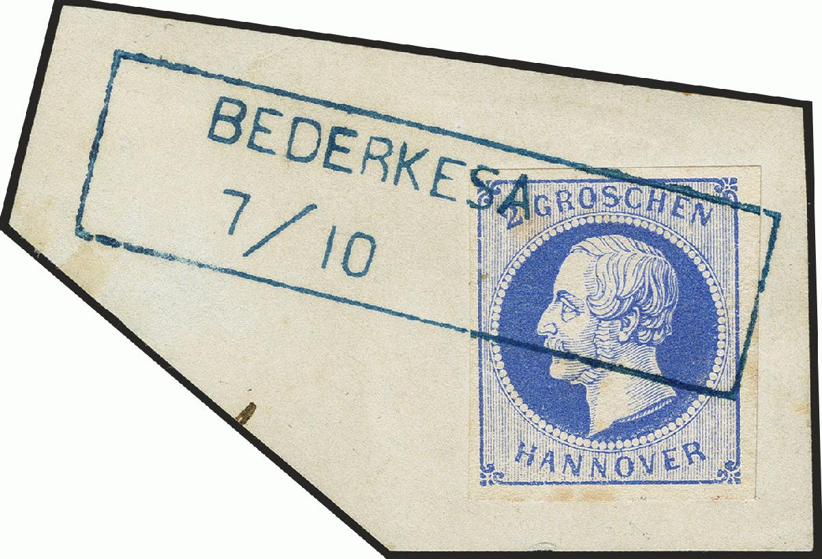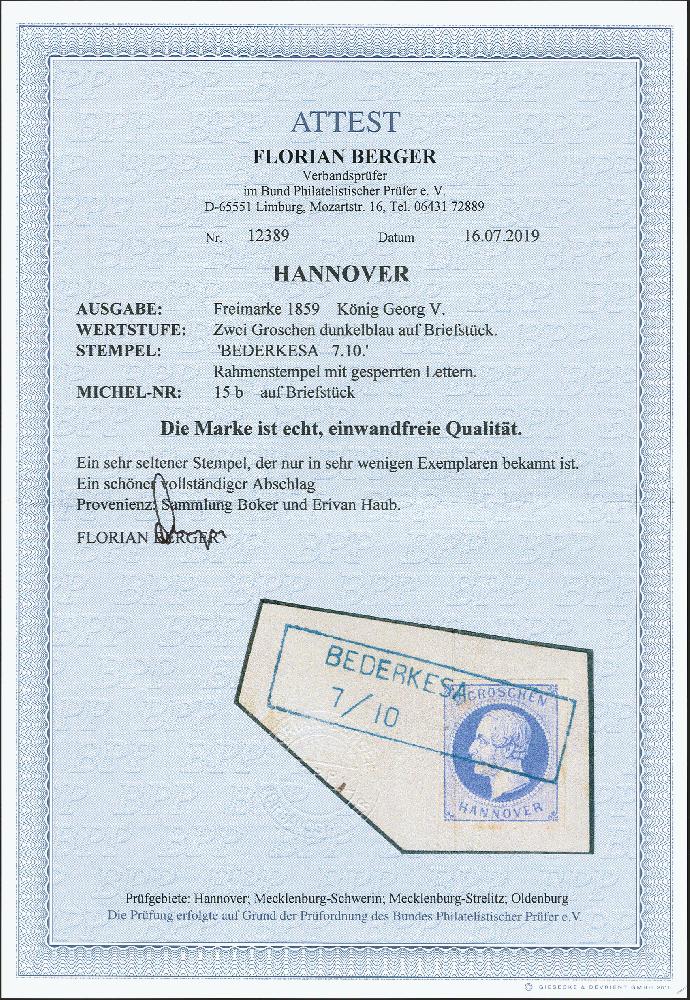 | Zusatzinformationen und Suchstichworte: | 372. Auktion Heinrich Köhler 14. Dezember 2019 Los 103 2 Groschen dunkelblau, voll- bis breitrandig mit glasklar und voll aufgesetztem Wanderstempel "BEDERKESA 7/10" auf Briefstück, Kabinett. Fotoattest Berger BPP (2019) Ausruf 300,00 EUR Zuschlag 900,00 EUR (aus der Sammlung Erivan Haub) |