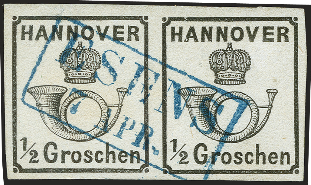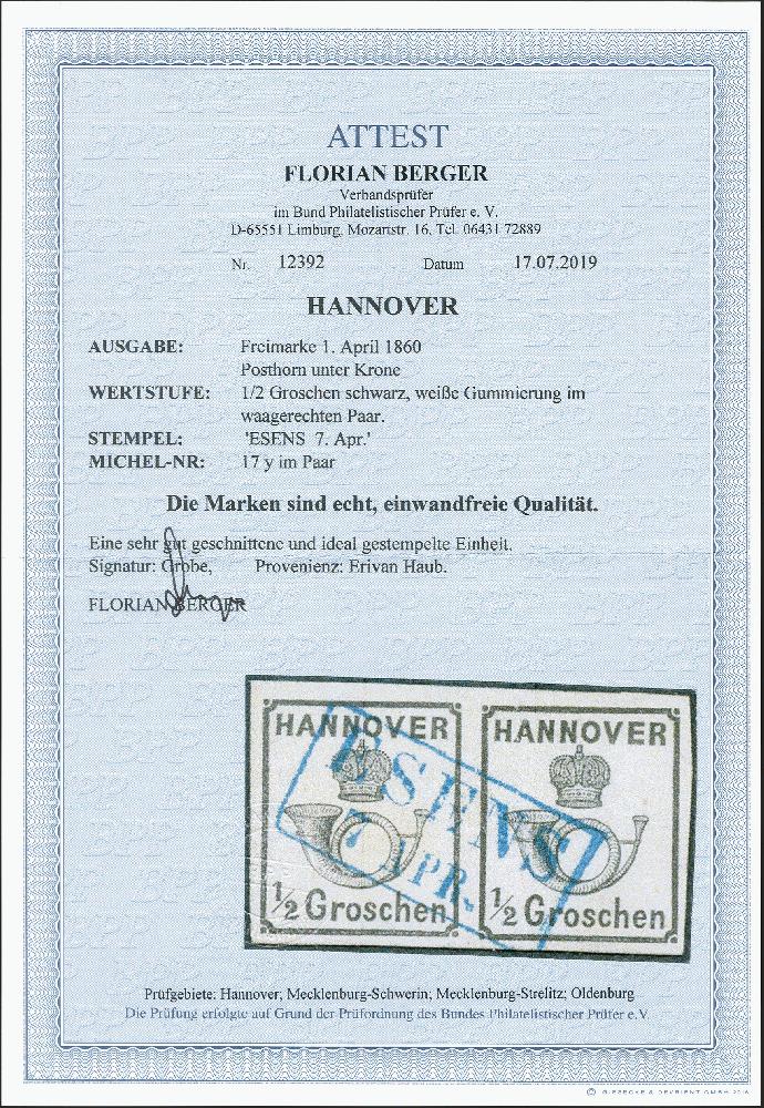 | Zusatzinformationen und Suchstichworte: | 372. Auktion Heinrich Köhler 14. Dezember 2019 Los 105 1860, Drucksachenmarke ½ Groschen schwarz, weiße Gummierung, waagerechtes Paar, allseits breitrandig, mit sauber und praktisch vollständig aufgesetztem blauen Rahmenstempel "ESENS 7 APR.", Kabinett. Signiert Grobe und Fotoattest Berger BPP (2019) Ausruf 200,00 EUR Zuschlag 550,00 EUR (aus der Sammlung Erivan Haub) |