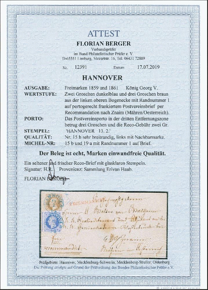 | Zusatzinformationen und Suchstichworte: | 372. Auktion Heinrich Köhler 14. Dezember 2019 Los 107 1859, Georg V 2 Groschen dunkelblau, allseits sehr breit- bis überrandig mit Teilen von 2 Nachbarmarken, zusammen mit 1861, 3 Groschen braun, linke obere Bogenecke mit Reihenzähler "1", beide mit sauber aufgesetztem kleinen DKr. "HANNOVER 13/2" auf rekommandiertem Briefkuvert nach Znaim im Kaiserreich Österreich. Ein schöner Brief mit 2 Ausnahme-Marken. Fotoattest Berger BPP (2019) Ausruf 300,00 EUR Zuschlag 650,00 EUR (aus der Sammlung Erivan Haub) |