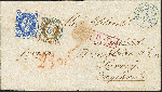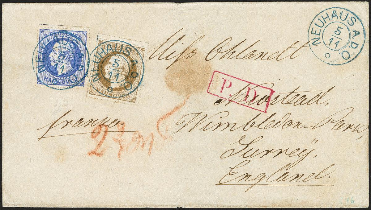 | Zusatzinformationen und Suchstichworte: | 372. Auktion Heinrich Köhler 14. Dezember 2019 Los 108 1864, Durchstichausgabe, 2 Groschen ultramarin und 3 Groschen braun, beide mit weißem Gummi, farbfrisch und gut durchstochen mit sauber auf- und nebengesetztem blauen DKr. "NEUHAUS A.D.O. 5/11" (1864) auf Briefhülle nach England mit ausgewiesenem Weiterfranko von 2 3/4 Silbergroschen. In der Hülle kleiner Siegelfleck, sonst einwandfrei. Sehr frühes Verwendungsdatum der 2 Groschen-Marke. Fotoattest Berger BPP (2019) Ausruf 300,00 EUR Zuschlag 500,00 EUR (aus der Sammlung Erivan Haub) |
