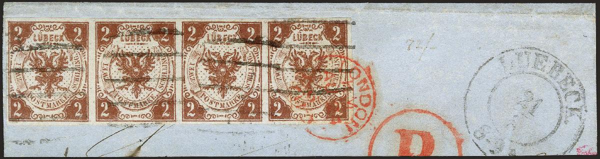 | Zusatzinformationen und Suchstichworte: | 372. Auktion Heinrich Köhler 14. Dezember 2019 Los 113 1859, 2 Schilling rötlichbraun im waagerechten 4er-Streifen, sehr schön farbfrisch und allseits breitrandig, mit sauber aufgesetzten Strichstempeln, die rechte Marke zusätzlich mit übergehendem roten Transitstempel "LONDON AU 24 .." auf großen Briefstück mit nebengesetztem Doppelkreisstempel "LUEBECK 21/8". Die rechte Marke in der oberen Randlinie rechts Bugspur, sonst völlig tadellose und ursprüngliche Erhaltung. Ein sehr schöner Streifen von größter Seltenheit; einer von 2 bekannten gestempelten 4er-Streifen der 1. Ausgabe, größte bekannte gebrauchte Einheit dieser Marke und mit Stempelentwertung ein Unikat. Signiert Drahn und Kruschel sowie Fotoattest Heitmann BPP (2019) Ausruf 8.000,00 EUR Zuschlag 13.000,00 EUR (aus der Sammlung Erivan Haub) |