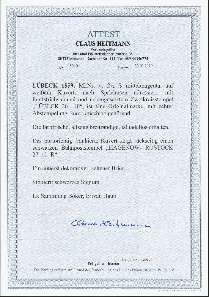 | Zusatzinformationen und Suchstichworte: | 372. Auktion Heinrich Köhler 14. Dezember 2019 Los 115 2½ Schilling mittelmagenta, allseits breitrandig und in schöner frischer Farbe, mit sauber aufgesetztem Strichstempel auf weißem Briefkuvert mit sauber nebengesetztem Doppelkreisstempel "LUEBECK 26 10" nach Spriehusen bei Neu-Buckow in Mecklenburg mit rückseitigem Bahnpoststempel "HAGENOW-ROSTOCK", Luxus. Fotoattest Heitmann BPP (2019) Ausruf 1.500,00 EUR Zuschlag 3.200,00 EUR (aus der Sammlung Erivan Haub) |