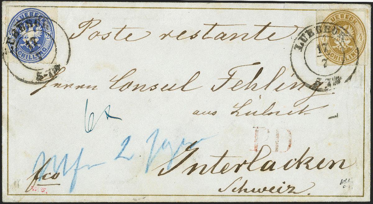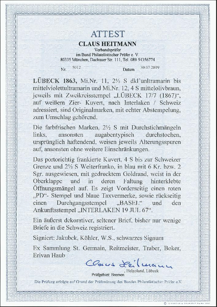 | Zusatzinformationen und Suchstichworte: | 372. Auktion Heinrich Köhler 14. Dezember 2019 Los 117 1863, 2½ Schilling ultramarin und 4 Schilling olivbraun, erstere mit kleinem Durchstichmangel links, sonst beide einwandfrei und farbfrisch, mit jeweils sauber aufgesetztem Doppelkreisstempel "LUEBECK 17/7" (1867) auf Briefkuvert mit goldfarbener Zierborde nach Interlaken in der Schweiz mit rückseitigem Bahnpoststempel "BASEL-OLTEN" und Ankunftsstempel. Der Brief ist mit 6½ Schilling portogerecht frankiert, "2" Silbergroschen bzw. "6" Kreuzer Weiterfranko vorderseitig notiert. Auslandsbriefe von Lübeck sind abgesehen von denen in den Ostseeraum sehr selten, in den 2. Schweizer Rayon haben wir nur einen weiteren registriert. Signiert Schulze, Traber und Jakubek sowie Fotoattest Heitmann BPP (2019) Ausruf 2.000,00 EUR Zuschlag 3.200,00 EUR (aus der Sammlung Erivan Haub) |