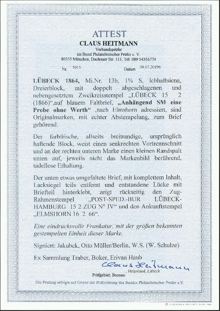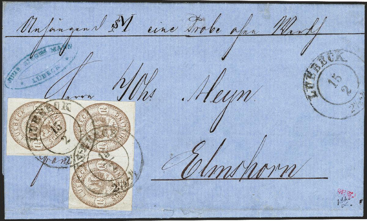 | Zusatzinformationen und Suchstichworte: | 372. Auktion Heinrich Köhler 14. Dezember 2019 Los 119 1864, Steindruckausgabe 1¼ Schilling dunkelbraun im 3er-Block, farbfrisch und allseits breitrandig mit sauber auf- und nebengesetztem Doppelkreisstempel "LUEBECK 15/2" auf komplettem Faltbrief mit handschriftlichem Vermerk "Anhängend eine Probe ohne Werth" nach Elmshorn mit rückseitigem Bahnpoststempel "LÜBECK-HAMBURG" und Ankunftsstempel. Schöne und tadellose Erhaltung. Der Brief unten etwas umgefaltet, zwischen den Marken kleiner Vortrennschnitt und im Unterrand winzigster Randspalt in der unteren Zwischenlinie. Ein schöner und frischer Brief mit der größten gebrauchten Einheit dieser Marke. Wir haben nur eine weitere 3er-Einheit auf Brief registriert. Signiert u.a. W. Schulze, Traber und Jakubek sowie Fotoattest Heitmann BPP (2019) Ausruf 1.500,00 EUR Zuschlag 3.600,00 EUR (aus der Sammlung Erivan Haub) |