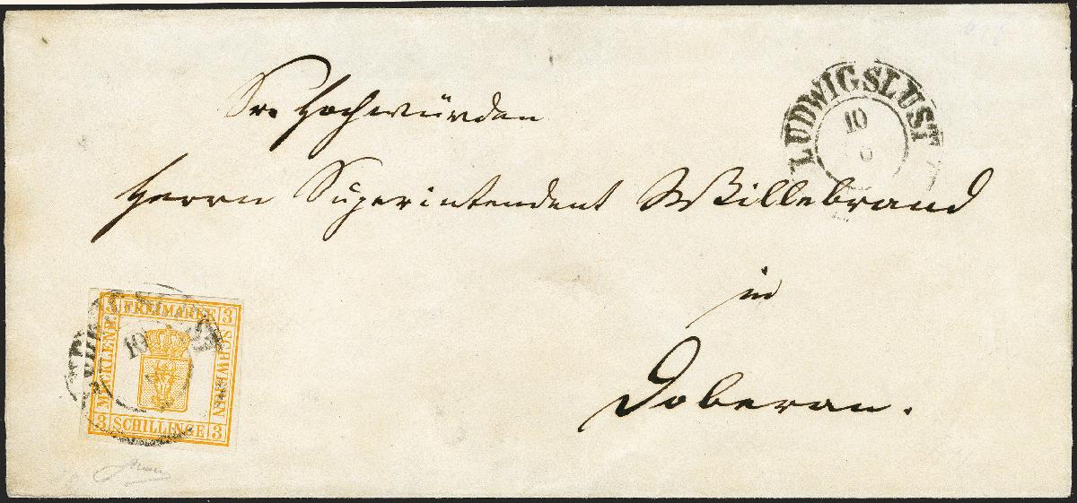 | Zusatzinformationen und Suchstichworte: | 372. Auktion Heinrich Köhler 14. Dezember 2019 Los 124 1856, 3 Schilling gelblichorange, voll- bis breitrandig und farbfrisch mit auf- und nebengesetztem Doppelkreisstempel "LUDWIGSLUST 10 6" auf Briefhülle (2 Seitenklappen fehlend) mit rückseitigem Kirchensiegel nach Doberan. Ein schöner Brief in einwandfreier Erhaltung. Signiert Friedl und Fotobefund Berger BPP Ausruf 150,00 EUR Zuschlag 460,00 EUR (aus der Sammlung Erivan Haub) |