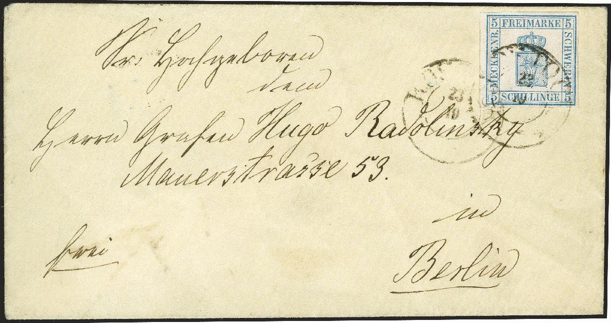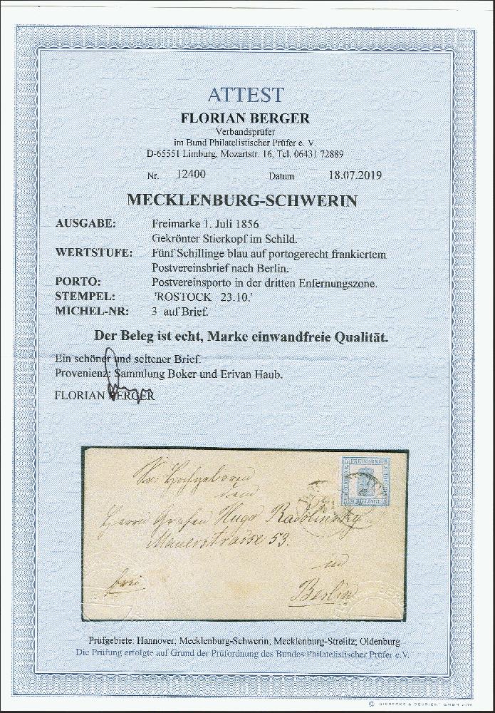 | Zusatzinformationen und Suchstichworte: | 372. Auktion Heinrich Köhler 14. Dezember 2019 Los 125 5 Schilling blau, voll- bis breitrandig und farbfrisch mit zweimal leicht aufgesetztem Doppelkreisstempel "ROSTOCK 23/10" auf Briefkuvert nach Berlin mit rückseitigen Bahnpost- und Ausgabestempeln. Das Kuvert außerhalb der Frankatur leicht knittrig, sonst einwandfrei. Eine attraktive Einzelfrankatur. Fotoattest Berger BPP (2019) Ausruf 400,00 EUR Zuschlag 1.300,00 EUR (aus der Sammlung Erivan Haub) |