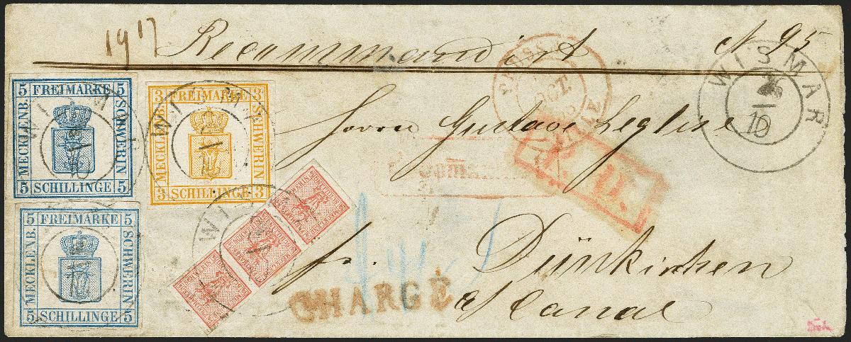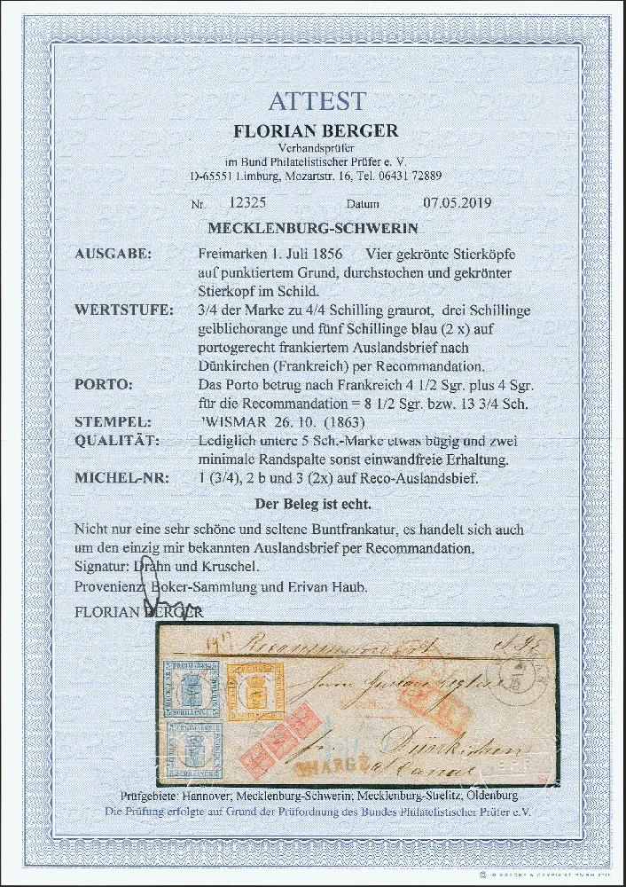 | Zusatzinformationen und Suchstichworte: | 372. Auktion Heinrich Köhler 14. Dezember 2019 Los 126 1856, 3/4 Schilling rot, 3 Schilling gelblichorange und 5 Schilling blau, 2 Einzelwerte in unterschiedlichen Nuancen, alle farbfrisch und voll- bis breitrandig mit Doppelkreisstempel "WISMAR 26/10" (1863) auf eingeschriebenem Briefkuvert nach Dünkirchen, Frankreich mit Transit- und Ankunftsstempeln. Die unten links klebende 5 Schilling etwas knittrig und im Oberrand 2 minimale Randspalte, das Markenbild jedoch nicht berührend (möglicherweise sogenannte 'Portemonnaie-Marke'). Der Brief ist mit 13 3/4 Schilling (entsprechend 8½ Silbergroschen) portogerecht frankiert. Briefe mit der kompletten 1. Ausgabe sind sehr selten, wir haben neben diesem noch 4 weitere mit verschiedenen Kombinationen registriert, darüber hinaus handelt es sich hier um die zweithöchste registrierte Frankatur sowie um den einzig bekannten frankierten Einschreibebrief Mecklenburg-Schwerins in das Nicht-Vereins-Ausland. Einer der besten Auslandsbriefe der altdeutschen Staaten. Signiert Drahn und Kruschel, Fotoattest Berger BPP (2019) Ausruf 10.000,00 EUR Zuschlag 60.000,00 EUR (aus der Sammlung Erivan Haub) |