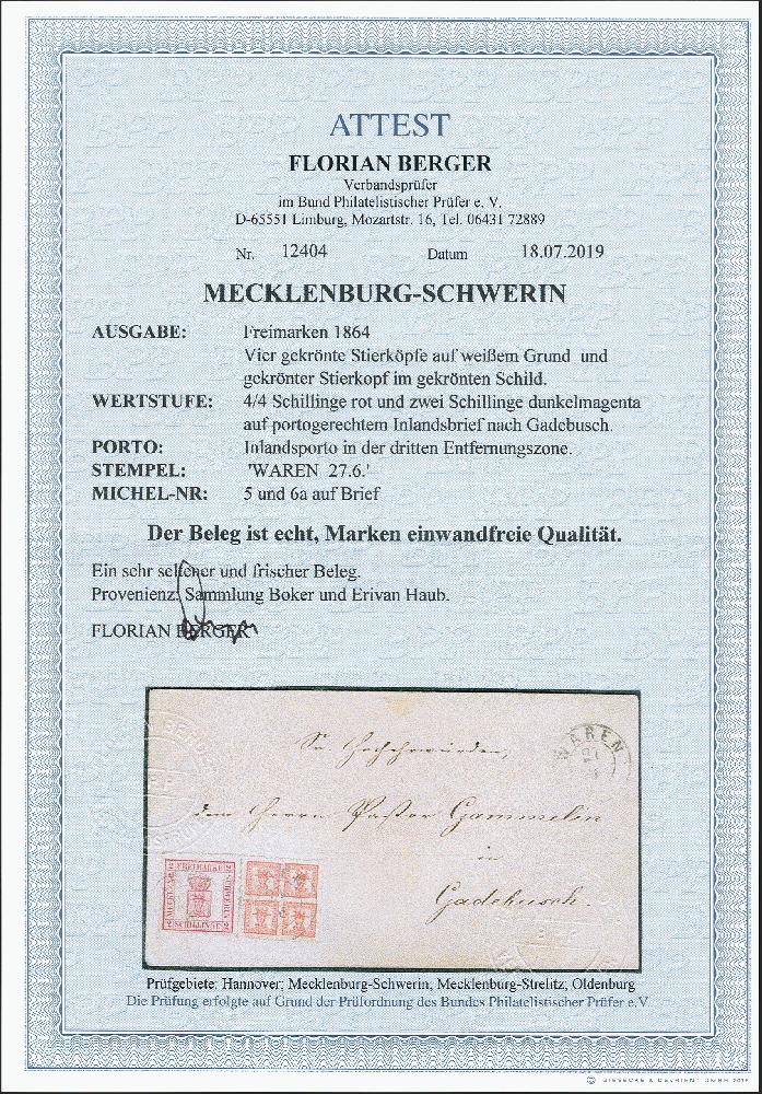 | Zusatzinformationen und Suchstichworte: | 372. Auktion Heinrich Köhler 14. Dezember 2019 Los 128 1864, Durchstochene Ausgabe auf weißem Grund, 4/4 Schilling rot mit 1866, 2 Schilling dunkelmagenta, mit leicht auf- und nebengesetztem Doppelkreisstempel "WAHREN 27/6" auf Briefkuvert nach Gadebusch. Eine sehr seltene Frankaturkombination, wir haben nur eine weitere registriert. Ein attraktiver Brief in sehr schöner und einwandfreier Erhaltung. Fotoattest Berger BPP (2019) Ausruf 1.000,00 EUR Zuschlag 3.400,00 EUR (aus der Sammlung Erivan Haub) |