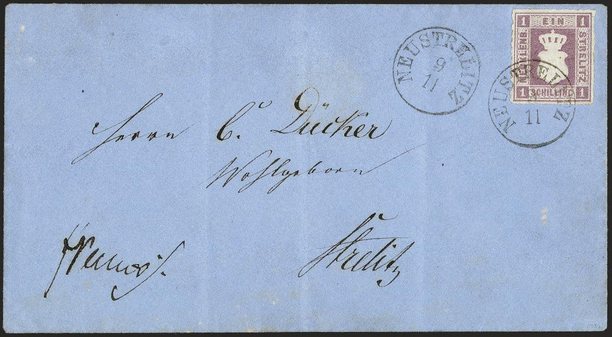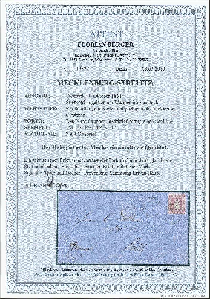 | Zusatzinformationen und Suchstichworte: | 372. Auktion Heinrich Köhler 14. Dezember 2019 Los 131 1864, Quadratausgabe 1 Schilling grauviolett in sehr schöner tiefer und frischer Farbe und einwandfrei durchstochen, mit klar auf- und nebengesetztem EKr. "NEUSTRELITZ 9/11", zusätzlich nebengesetzt, auf blauem Ortsbrief-Kuvert, dieses außerhalb der Frankatur leicht gefaltet, sonst tadellose Erhaltung. Einer der schönsten Briefe mit dieser seltenen und schwierigen Marke. Signiert Thier und Decker sowie Fotoattest Berger BPP (2019) Ausruf 5.000,00 EUR Zuschlag 18.000,00 EUR (aus der Sammlung Erivan Haub) |
