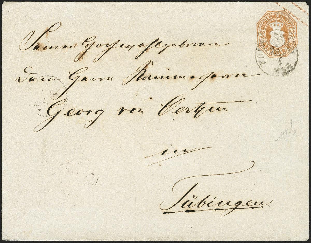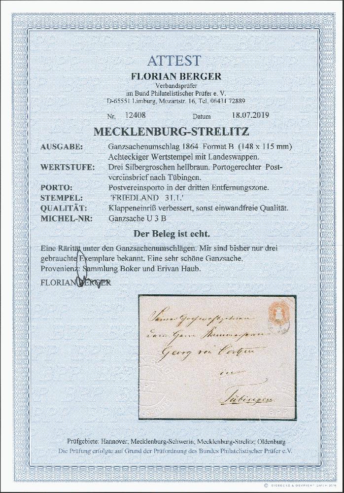 | Zusatzinformationen und Suchstichworte: | 372. Auktion Heinrich Köhler 14. Dezember 2019 Los 135 Umschlag 3 Silbergroschen hellbraun im Großformat mit alleiniger Entwertung durch auf den Wertstempel aufgesetzten EKr. "FRIEDLAND 31/1" nach Tübingen im Königreich Württemberg mit rückseitigem Durchgangsstempel von Prenzlau, württembergischem Bahnpoststempel und Distributionsstempel von Tübingen. Zweifellos der qualitativ hochwertigste der drei bekannten gebrauchten Exemplare dieses Umschlages. Eine der seltensten Ganzsachen der altdeutschen Staaten. Signiert Bloch und Fotoattest Berger BPP (2019) Ausruf 5.000,00 EUR Zuschlag 10.000,00 EUR (aus der Sammlung Erivan Haub) |