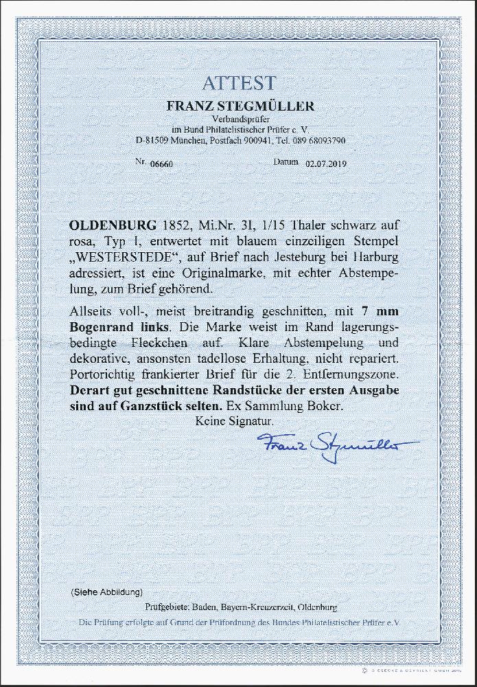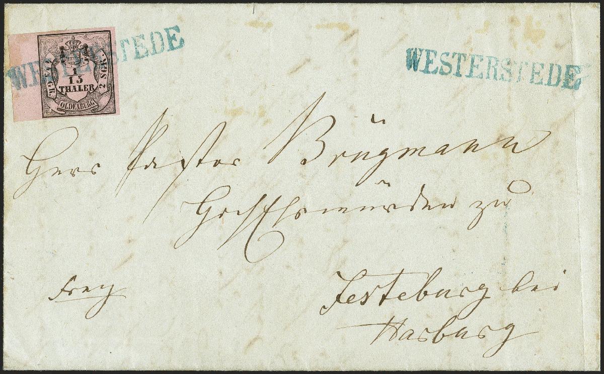 | Zusatzinformationen und Suchstichworte: | 372. Auktion Heinrich Köhler 14. Dezember 2019 Los 137 1/15 Taler schwarz auf rosa, Type I, farbfrisches, voll- bis breitrandiges linkes Randstück mit 7 mm Bogenrand, mit sauber auf- und nebengesetztem blauen Langstempel "WESTERSTEDE" auf Faltbrief nach Jesteburg bei Harburg in Hannover. Im Bogenrand der Marke leichte lagerungsbedingte Verfärbung, sonst tadellose Erhaltung. Derartig breite Randstücke sind bei Oldenburg - und insbesondere bei der ersten Ausgabe - sehr selten. Ein ganz außergewöhnlicher Brief. Fotoattest Stegmüller BPP (2019) Ausruf 1.000,00 EUR Zuschlag 1.200,00 EUR (aus der Sammlung Erivan Haub) |