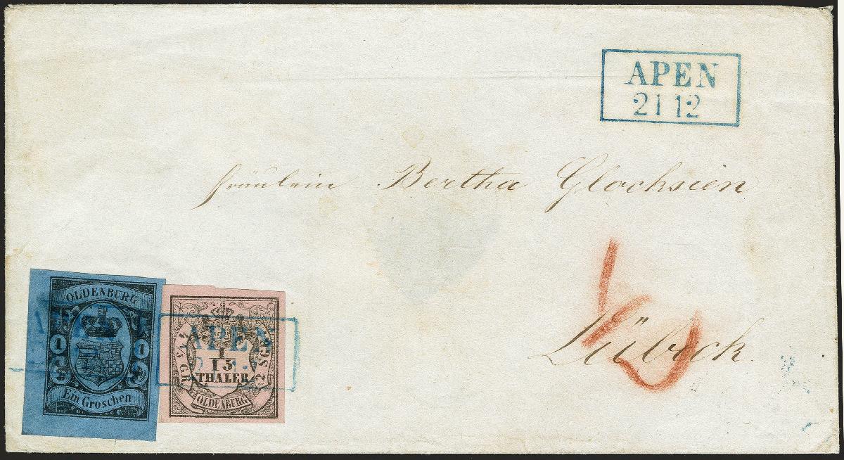 | Zusatzinformationen und Suchstichworte: | 372. Auktion Heinrich Köhler 14. Dezember 2019 Los 138 1852, Hauswappen, 1/15 Taler schwarz auf rosa, Type III, in Mischfrankatur mit 1859, 1 Groschen schwarz auf blau, beide breit- bis überrandig, die 1 Groschen aus der linken unteren Bogenecke stammend mit ca. 3,5 mm Bogenrändern links und unten, mit sauber und gerade auf- und nebengesetztem blauen Rahmenstempel "APEN 21 12" auf weißem Briefkuvert nach Lübeck mit rückseitigem Ausgabestempel. Besonders schöne und frische Erhaltung. In der Kombination mit der Bogenecke wahrscheinlich der schönste der wenigen bekannten Briefe mit dieser Mischfrankatur. Fotoattest Stegmüller BPP (2019) Ausruf 3.000,00 EUR Zuschlag 5.500,00 EUR (aus der Sammlung Erivan Haub) |