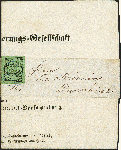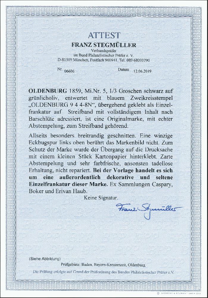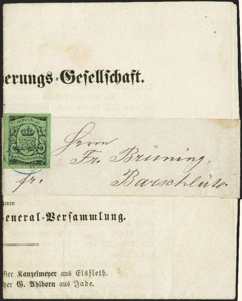 | Zusatzinformationen und Suchstichworte: | 372. Auktion Heinrich Köhler 14. Dezember 2019 Los 139 1859, Staatswappen auf farbigem Papier, 1/3 Groschen schwarz auf grün, farbfrisch und allseits besonders breitrandig geschnitten, mit blauem DKr. "OLDENBURG 9 4" auf vollständiger Drucksachensendung der oldenburgischen Versicherungs-Gesellschaft nach Barschlüte mit Ankunftsstempel von Berne. Die Marke zeigt links oben außerhalb des Markenbildes eine winzige Eckbugspur im Übergang von Schleife auf Drucksache, sie wurde zum Schutz in diesem Bereich mit einem kleinen Stück Kartonpapier hinterklebt. Ansonsten völlig tadellose und sehr schöne Erhaltung. Einzelfrankaturen dieser Marke sind außerordentlich selten, die hier angebotene zählt zu den bekanntesten und schönsten Stücken der Oldenburg-Philatelie. Fotoattest Stegmüller BPP (2019) Ausruf 25.000,00 EUR Zuschlag 28.000,00 EUR (aus der Sammlung Erivan Haub) |