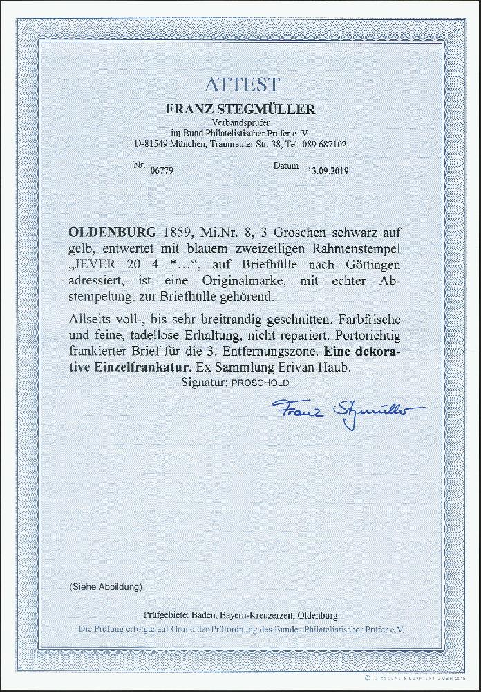 | Zusatzinformationen und Suchstichworte: | 372. Auktion Heinrich Köhler 14. Dezember 2019 Los 141 3 Groschen schwarz auf gelb, farbfrisch und voll- bis sehr breitrandig mit auf- und nebengesetztem blauen Rahmenstempel "JEVER 20 4" auf kleiner Briefhülle nach Göttingen mit Ankunftsstempel vom nächsten Tag. Eine schöne Einzelfrankatur in einwandfreier Erhaltung. Signiert Pröschold und Fotoattest Stegmüller BPP (2019) Ausruf 500,00 EUR Zuschlag 1.000,00 EUR (aus der Sammlung Erivan Haub) |