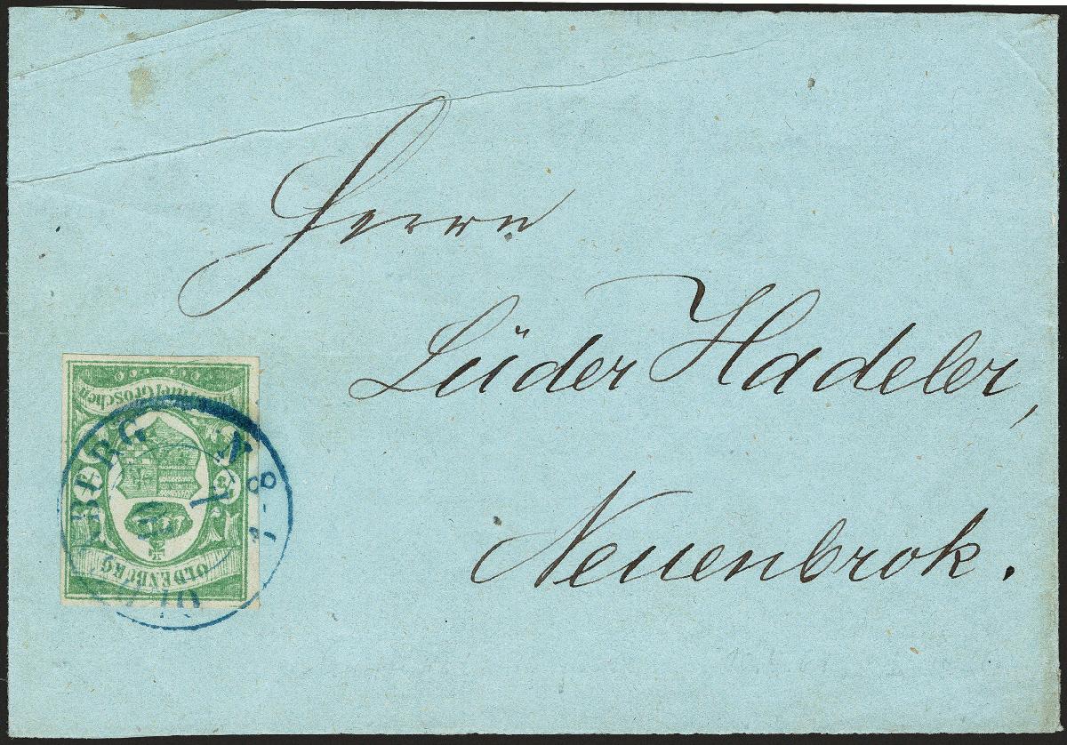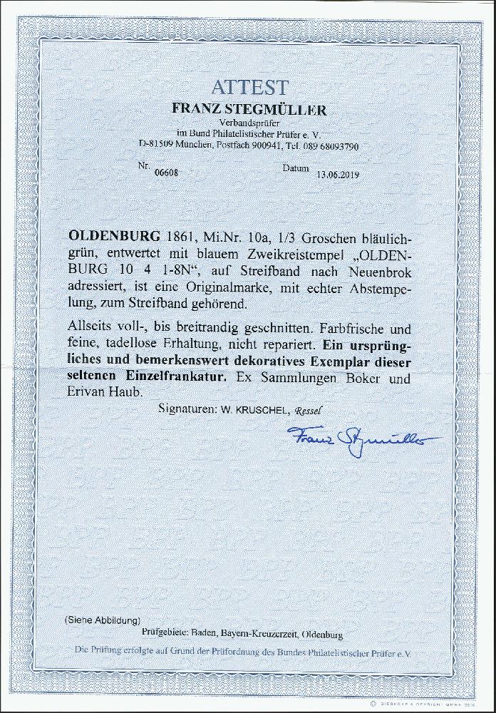 | Zusatzinformationen und Suchstichworte: | 372. Auktion Heinrich Köhler 14. Dezember 2019 Los 143 1/3 Groschen bläulichgrün in sehr schöner tiefer Farbe, allseits voll- bis breitrandig mit sehr schön kontrastierendem blauen DKr. "OLDENBURG 10 4" auf vollständigem kleinen Streifband nach Neuenbrok bei Elsfleth. Eine besonders schöne und sehr seltene Einzelfrankatur dieser Marke in tadelloser Erhaltung. Signiert Ressel und Kruschel sowie Fotoattest Stegmüller BPP (2019) Ausruf 8.000,00 EUR Zuschlag 8.500,00 EUR (aus der Sammlung Erivan Haub) |