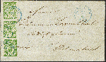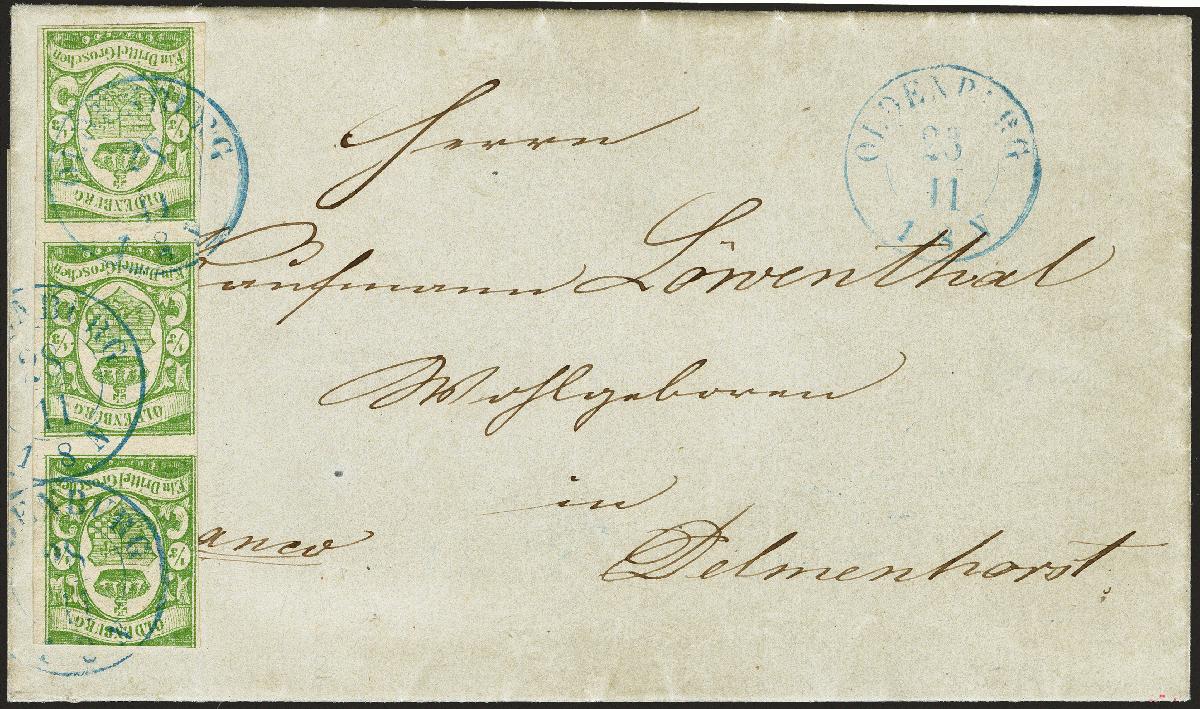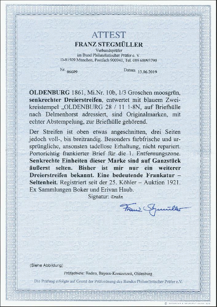 | Zusatzinformationen und Suchstichworte: | 372. Auktion Heinrich Köhler 14. Dezember 2019 Los 144 1861, Ausgabe auf weißem Papier 1/3 Groschen moosgrün im senkrechten 3er-Streifen in typischer, schöner frischer Farbe, die obere Marke oben leicht angeschnitten, sonst voll- bis breitrandig mit blauem DKr. "OLDENBURG 23 11" auf Briefhülle nach Delmenhorst mit rückseitigem Ankunftsstempel vom nächsten Tag. Ein attraktiver und äußerst seltener Brief. Schon Einzelfrankaturen der moosgrünen Nuance sind kaum zu finden, mit 3er-Streifen ist nur ein weiterer Brief bekannt (dieser mit waagerechtem Streifen); lose 3er-Streifen dieser Marke haben wir nicht registriert. Signiert Drahn und Fotoattest Stegmüller BPP (2019) Ausruf 25.000,00 EUR unverkauft (aus der Sammlung Erivan Haub) |