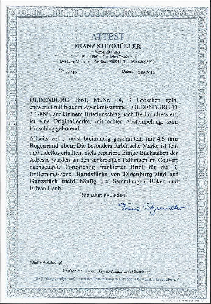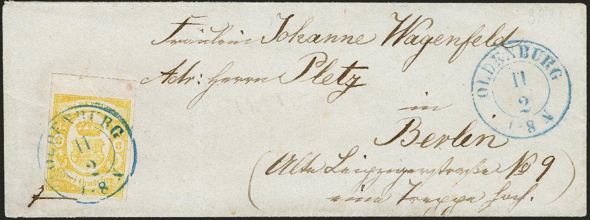 | Zusatzinformationen und Suchstichworte: | 372. Auktion Heinrich Köhler 14. Dezember 2019 Los 145 1861, 3 Groschen gelb in sehr schöner frischer Farbe und mit klarem Druck, allseits breitrandiges Oberrandstück mit 4,5 mm Bogenrand, mit klar auf- und nebengesetztem blauen DKr. "OLDENBURG 11/2" auf kleinem Damenkuvert nach Berlin mit rückseitigen Bahnpost- und Ausgabestempeln. Eine Faltung außerhalb der Frankatur geglättet und hier zwei winzige Nachmalungen in der Anschrift. Eine der schönsten Einzelfrankaturen dieser Marke in tadelloser Erhaltung und eins von nur 4 Randstücken dieser Marke, die wir auf Brief registriert haben. Signiert Kruschel und Fotoattest Stegmüller BPP (2019) Ausruf 1.500,00 EUR Zuschlag 2.200,00 EUR (aus der Sammlung Erivan Haub) |