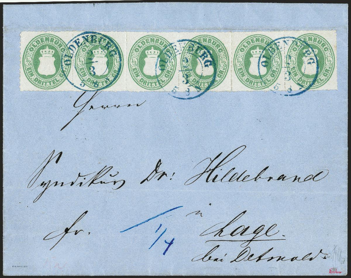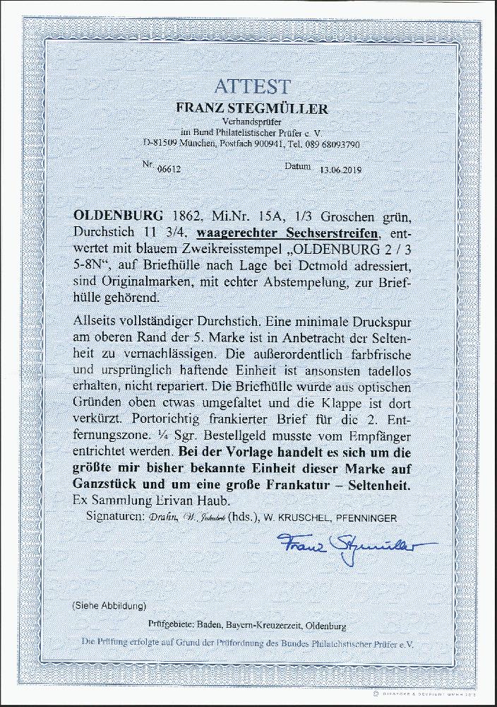 | Zusatzinformationen und Suchstichworte: | 372. Auktion Heinrich Köhler 14. Dezember 2019 Los 147 1862, Prägedruckausgabe, 1/3 Groschen grün, durchstochen 11 3/4, waagerechter 6er-Streifen, farbfrisch und einwandfrei durchstochen mit paarweise aufgesetztem blauen DKr. "OLDENBURG 2/3" (1863) auf Briefhülle nach Lage bei Detmold mit rückseitigem Ankunftsstempel. Die Briefhülle oben etwas umgefaltet und die Klappe dort verkürzt, sonst einwandfreie Erhaltung (eine minimale Druckspur am oberen Rand der 5. Marke ist in Anbetracht der Seltenheit zu vernachlässigen). Es handelt sich hier um die größte bekannte gebrauchte Einheit dieser Marke; wir haben nur einen weiteren 6er-Streifen registriert. Einer der bedeutendsten Briefe der letzten Ausgabe Oldenburgs. Signiert Drahn, Jakubek, Kruschel und Pfenninger sowie Fotoattest Stegmüller BPP (2019) Ausruf 4.000,00 EUR Zuschlag 24.000,00 EUR (aus der Sammlung Erivan Haub) |
