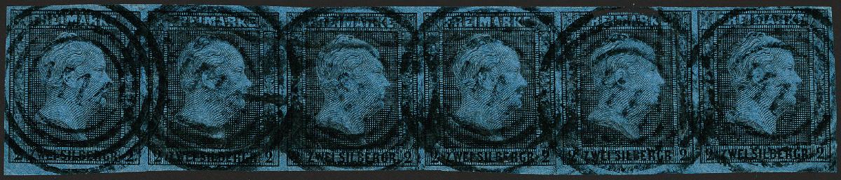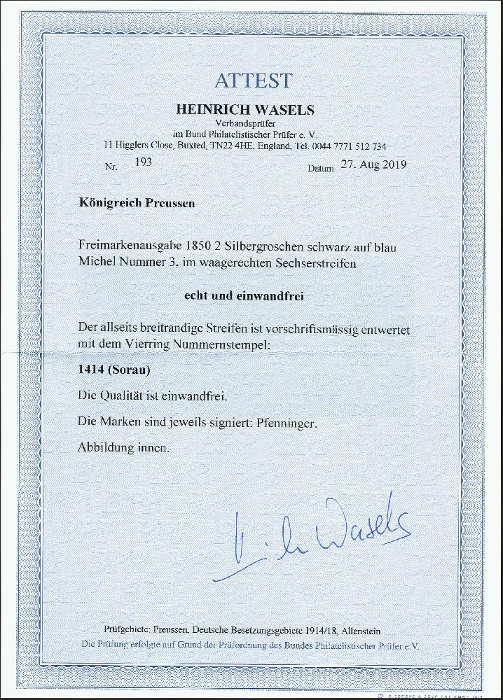 | Zusatzinformationen und Suchstichworte: | 372. Auktion Heinrich Köhler 14. Dezember 2019 Los 157 2 Silbergroschen schwarz auf blau im waagerechten 6er-Streifen, voll- bis meist breitrandig, jeder Wert einzeln entwertet durch Nr. "1414" SORAU. Ein seltener Streifen in sehr schöner Erhaltung. Signiert Pfenninger und Fotoattest Wasels BPP (2019) Ausruf 1.000,00 EUR Zuschlag 1.100,00 EUR (aus der Sammlung Erivan Haub) |