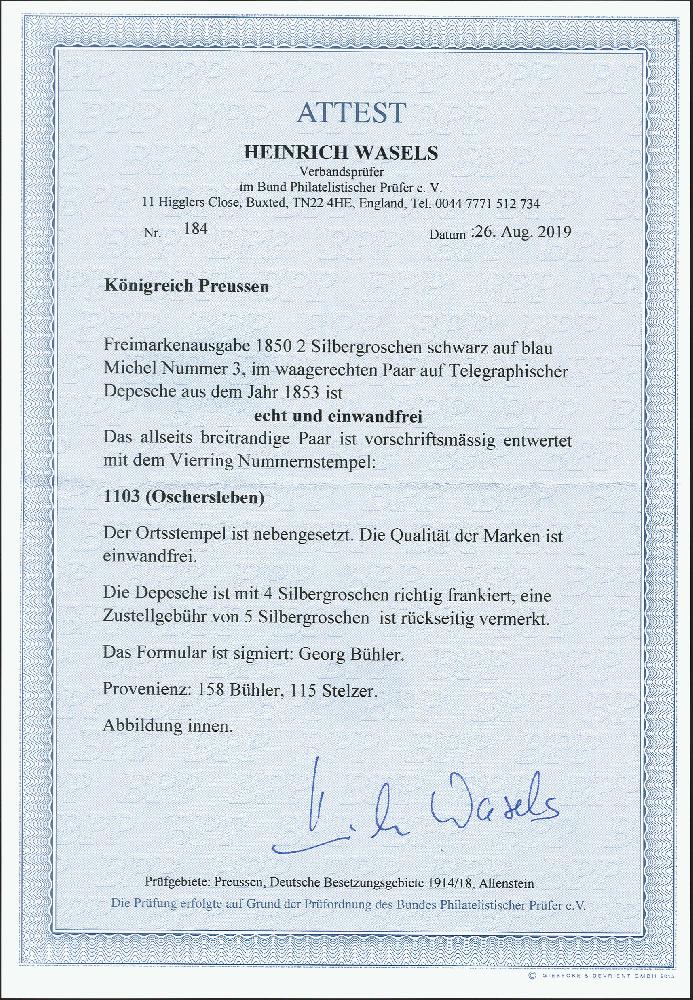 | Zusatzinformationen und Suchstichworte: | 372. Auktion Heinrich Köhler 14. Dezember 2019 Los 159 1850, 2 Silbergroschen schwarz auf blau im waagerechten Paar, farbfrisch und voll- bis breitrandig mit sauber aufgesetzter Nr. "1103" und nebengesetztem Rahmenstempel "OSCHERSLEBEN (28)/5" (1853) auf Telegramm-Umschlag als Chargé-Brief an die Papiermühle bei Wernigerode mit rückseitig notiertem Bestellgeld von 5 Silbergroschen. Das Paar ist tadellos, der Umschlag seitlich weitgehend geöffnet sowie einige kleine Fehlstellen im Papier (meist rückseitig). Frankierte Telegramm-Umschläge zählen zu den großen Seltenheiten der Preußen-Philatelie. Wir haben insgesamt nur 6 Stück registriert, davon 2 weitere mit der 1. Ausgabe, Fotoatteste Georg Bühler (1969) und Wasels BPP (2019) Ausruf 5.000,00 EUR Zuschlag 26.000,00 EUR (aus der Sammlung Erivan Haub) |