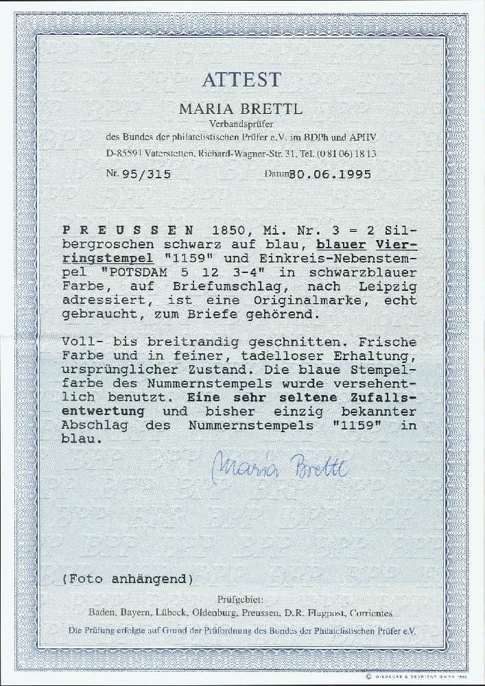 | Zusatzinformationen und Suchstichworte: | 372. Auktion Heinrich Köhler 14. Dezember 2019 Los 160 2 Silbergroschen schwarz auf blau, farbfrisch und voll- bis breitrandig mit sauber aufgesetzter blauer Nr. "1159" auf Briefkuvert mit nebengesetztem kleinen EKr. "POTSDAM 5 12" in schwarzblauer Farbe nach Leipzig mit Ankunftsstempel vom nächsten Tag. Die blaue Stempelfarbe wurde normalerweise in Potsdam nicht verwendet, es handelt sich hier um eine Zufallsentwertung, von der bisher kein weiteres Stück registriert ist. Fotoatteste Brettl BPP (1995) und Wasels BPP (2019) Ausruf 1.000,00 EUR Zuschlag 3.800,00 EUR (aus der Sammlung Erivan Haub) |