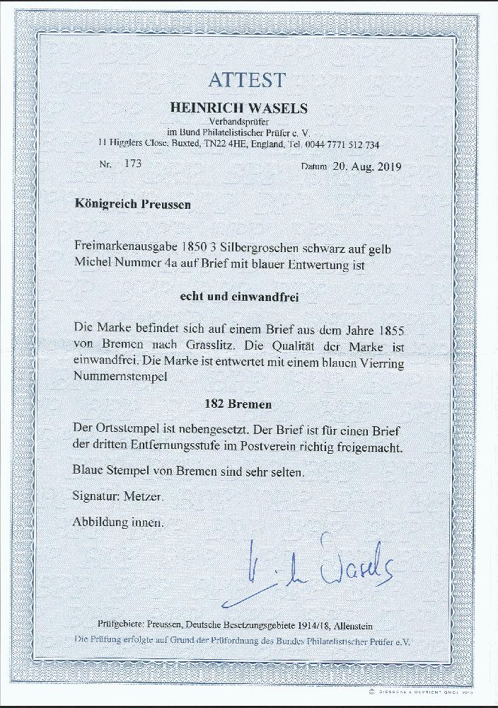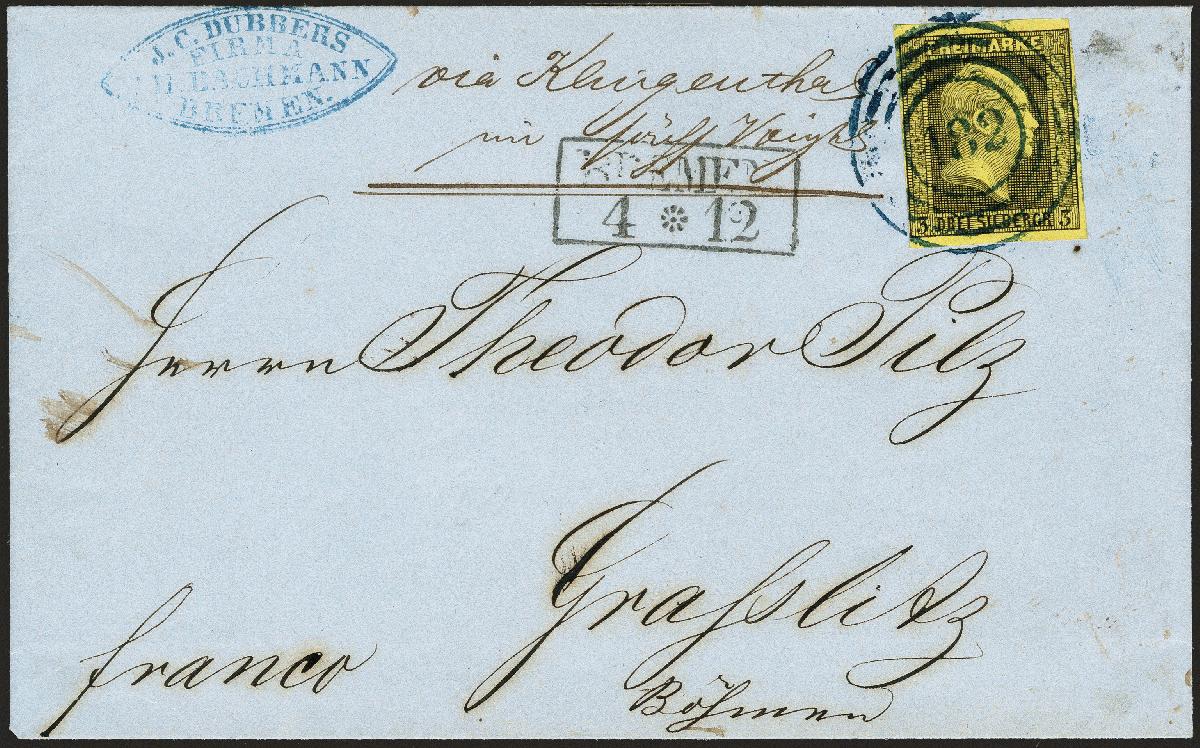 | Zusatzinformationen und Suchstichworte: | 372. Auktion Heinrich Köhler 14. Dezember 2019 Los 161 3 Silbergroschen schwarz auf gelb, voll- bis sehr breitrandig mit klar aufgesetzter blauer Nr. "182" und nebengesetztem schwarzen Rahmenstempel "BREMEN 4*12" (1855) auf Briefhülle nach Graslitz in Böhmen. Schöne und einwandfreie Erhaltung. Ein attraktiver Brief mit seltenem farbigen Nummernstempel im Wechselverkehr mit Österreich. Signiert Metzer, Fotoatteste Kastaun BPP (1987) und Wasels BPP (2019) Ausruf 1.000,00 EUR Zuschlag 1.000,00 EUR (aus der Sammlung Erivan Haub) |