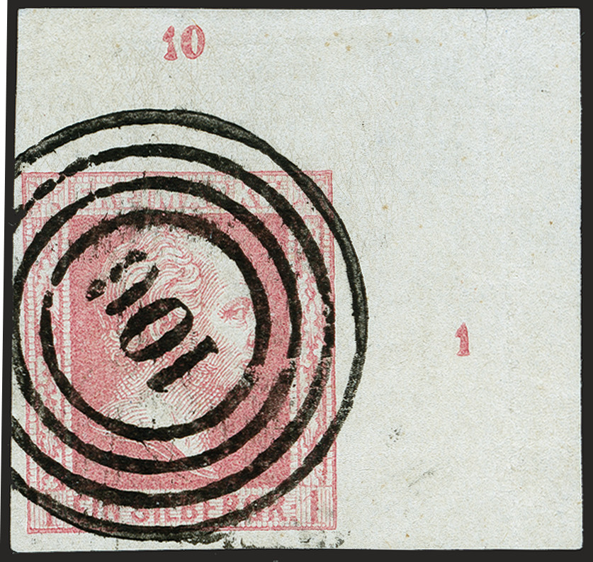 | Zusatzinformationen und Suchstichworte: | 372. Auktion Heinrich Köhler 14. Dezember 2019 Los 166 1857, Glatter Grund 1 Silbergroschen rosa, rechte obere Bogenecke mit Reihenzählern "1" und "10", farbfrisch und voll- bis breitrandig mit ca. 14/9,5 mm Bogenrändern, zentrisch entwertet durch Nr. "106" BERLIN. Im unteren Viertel unauffällige waagerechte Bugspur sowie rechts oben im breiten Außenrand kleine Stauchung mit Randspalt. Ein sensationelles Stück. Signiert Drahn und Kastaun BPP, Fotoattest Wasels BPP (2019) Ausruf 300,00 EUR Zuschlag 1.500,00 EUR (aus der Sammlung Erivan Haub) |