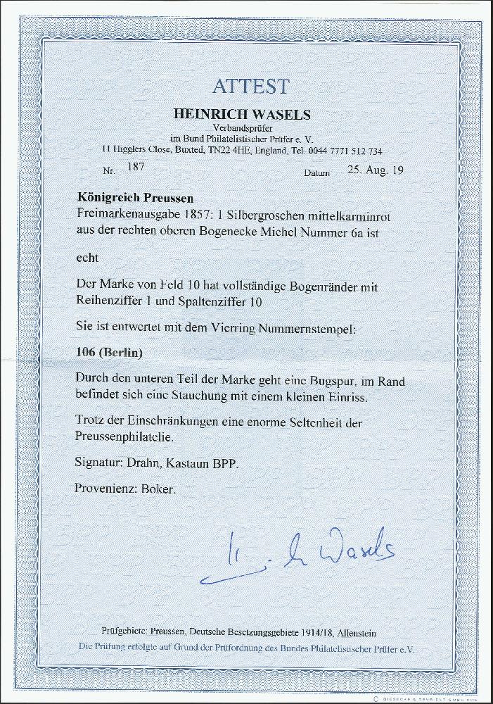 | Prüfer: | Wasels, Heinrich (BPP (Bund Philatelistischer Prüfer)) |