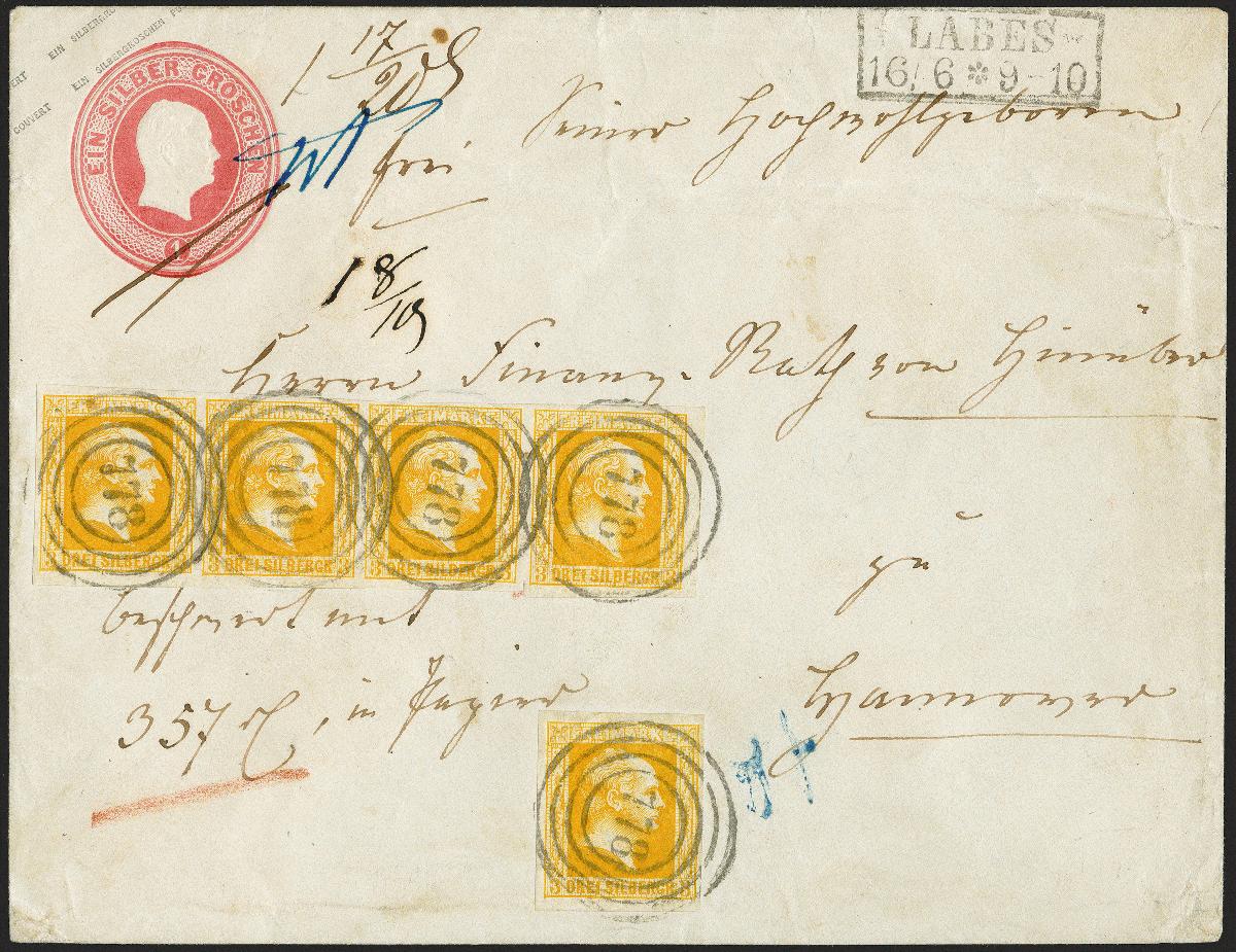 | Zusatzinformationen und Suchstichworte: | 372. Auktion Heinrich Köhler 14. Dezember 2019 Los 169 1857, Glatter Grund 3 Silbergroschen gelblichorange, waagerechter 4er-Streifen und Einzelmarke, alle sehr schön farbfrisch und voll- bis sehr breitrandig mit Nr. "778" als Zufrankatur auf Ganzsachenumschlag 1855, 1 Silbergroschen rosa im Großformat mit nebengesetztem Aufgabestempel "LABES 16/6" als Wertbrief nach Hannover. Der Umschlag außerhalb der Frankatur teils etwas knittrig, sonst tadellose Erhaltung (der Streifen zwei winzige Vortrennschnitte außerhalb der Markenbilder). Eine sehr schöne Farbfrankatur mit auf Brief sehr seltenem 4er-Streifen. Fotoattest Wasels BPP (2019) Ausruf 2.000,00 EUR Zuschlag 3.000,00 EUR (aus der Sammlung Erivan Haub) |