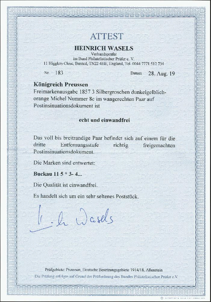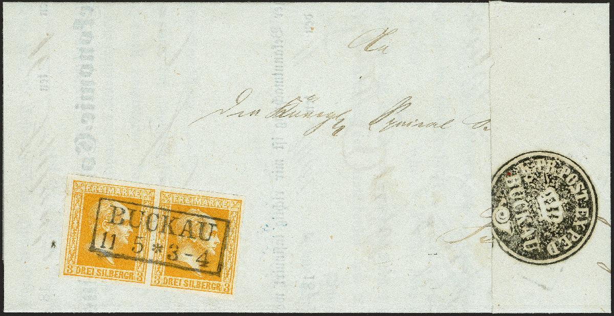 | Zusatzinformationen und Suchstichworte: | 372. Auktion Heinrich Köhler 14. Dezember 2019 Los 171 3 Silbergroschen dunkelgelblichorange im waagerechten Paar, sehr schön farbfrisch und allseits breitrandig mit zentrisch und klar aufgesetztem Rahmenstempel "BUCKAU 11 5" (1859) auf Insinuationsdokument nach Filehne. Das Dokument wurde rechts zur Demonstration des an sich innen abgeschlagenen Krone/Posthorn-Stempels umgefaltet. Ein besonders schönes Stück. Fotoattest Wasels BPP (2019) Ausruf 500,00 EUR Zuschlag 600,00 EUR (aus der Sammlung Erivan Haub) |